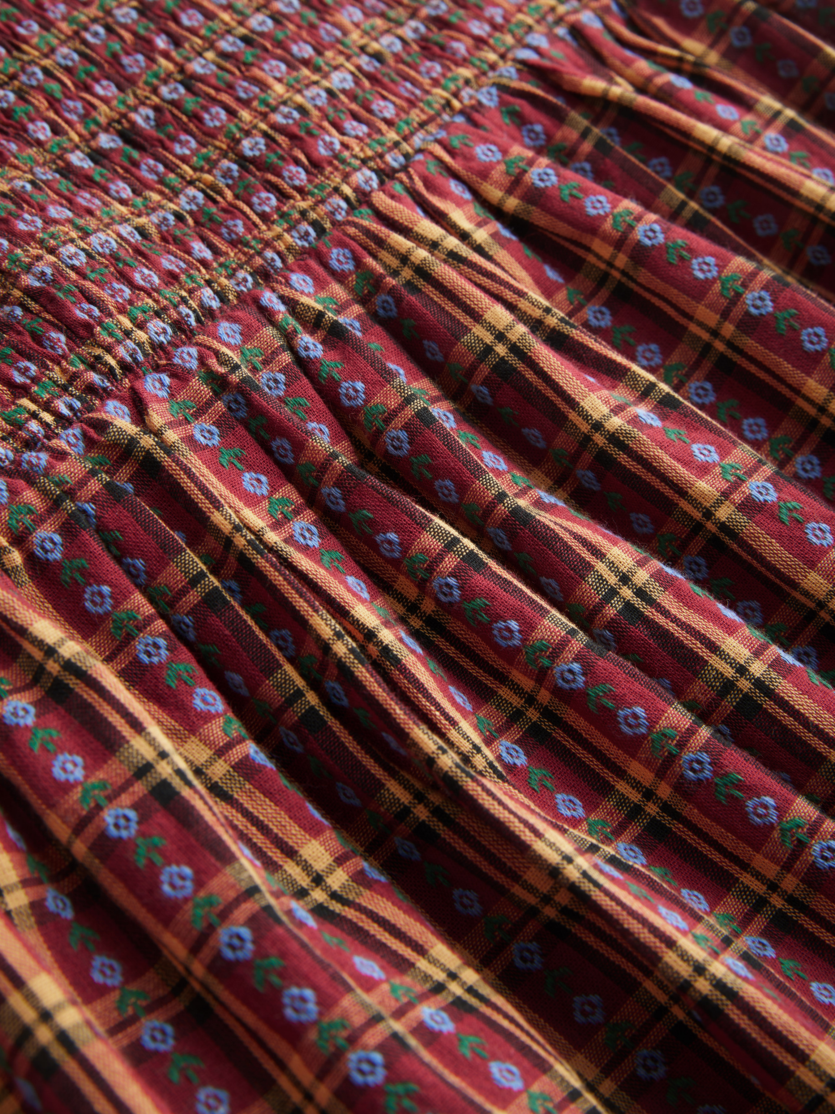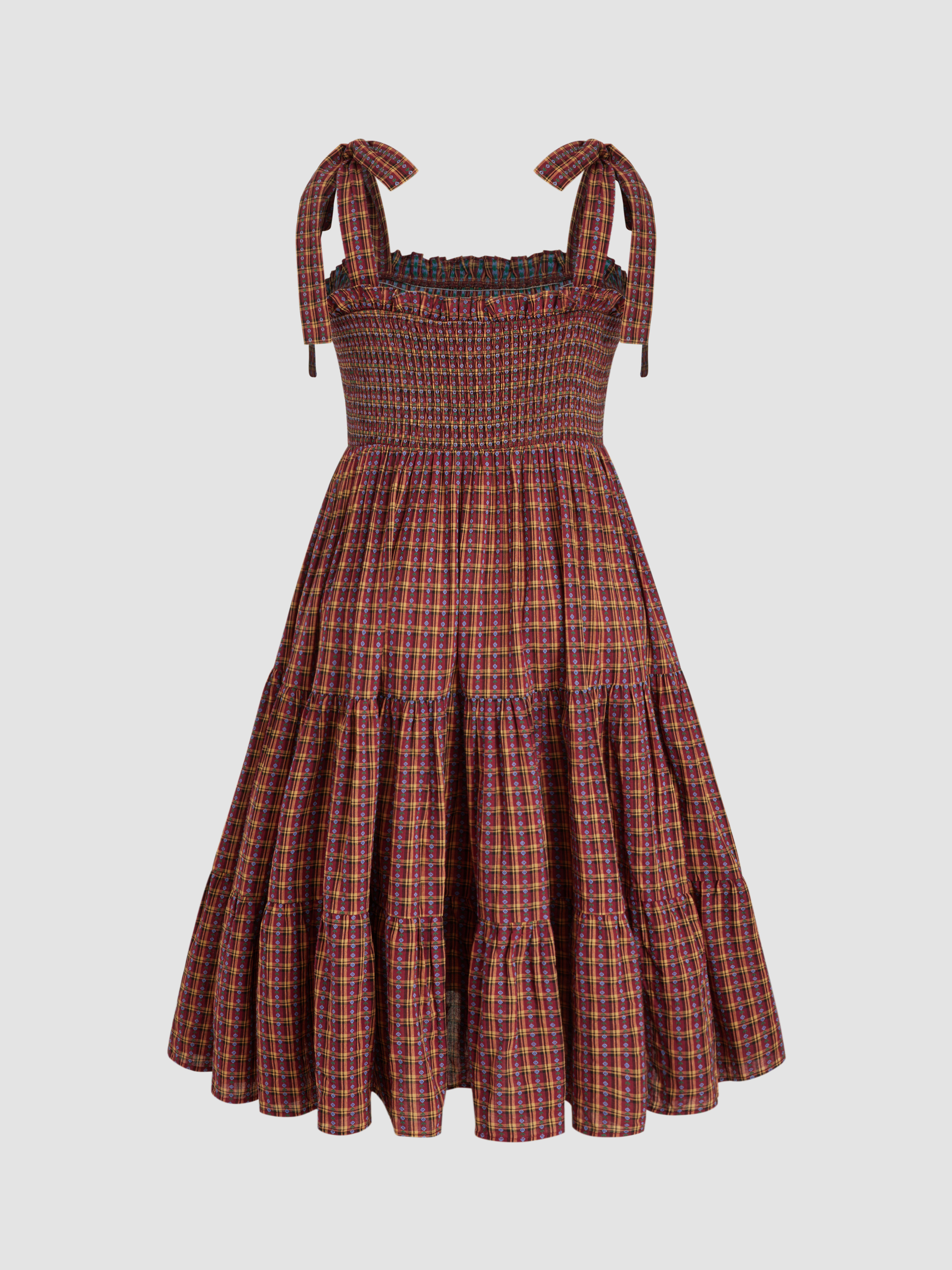 100% Cotton Knotted Floral Tartan Shirred Midi Dress Curve & Plus