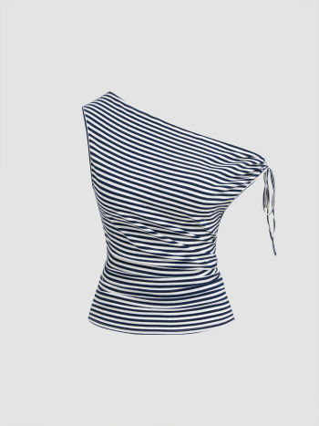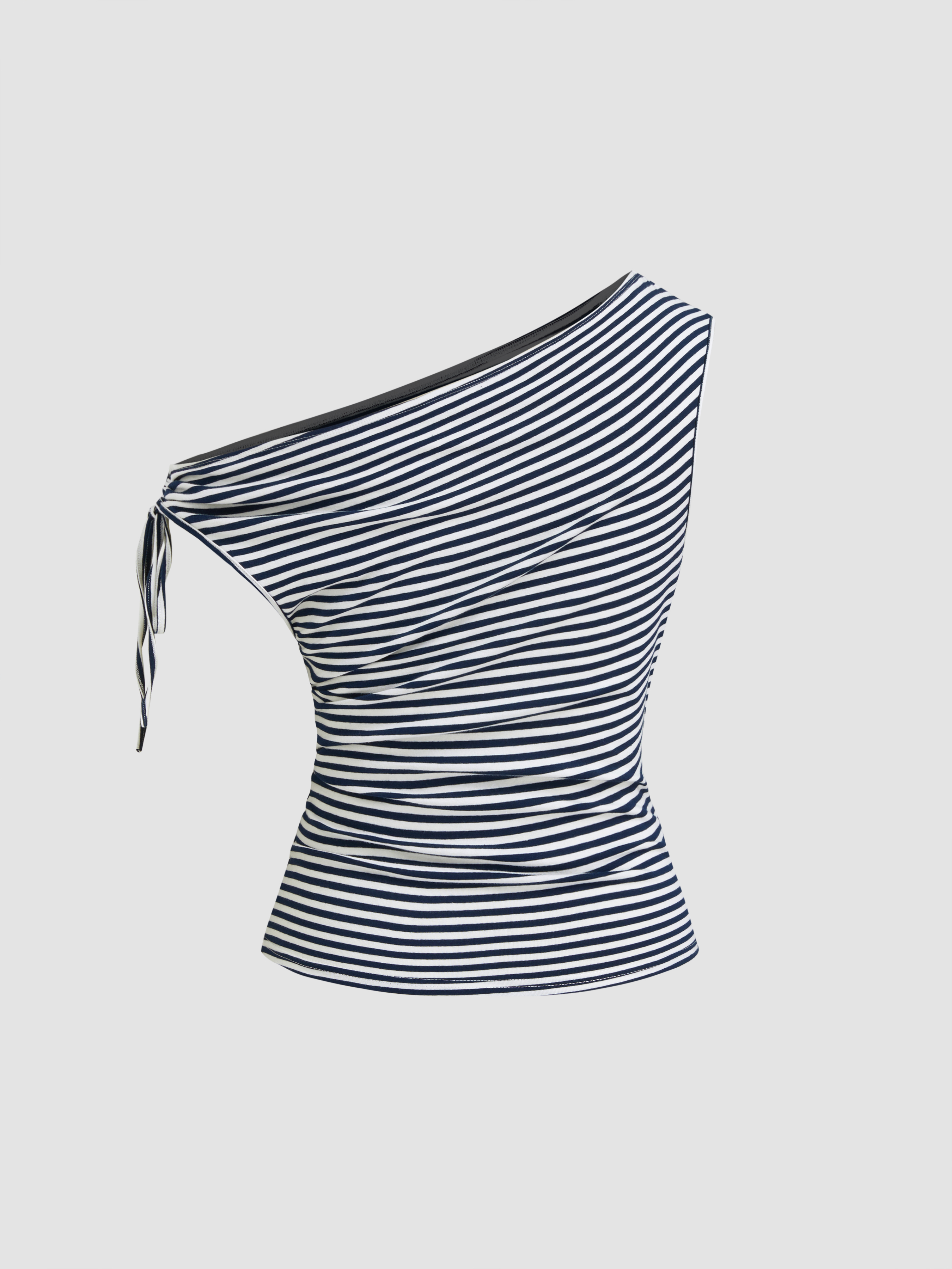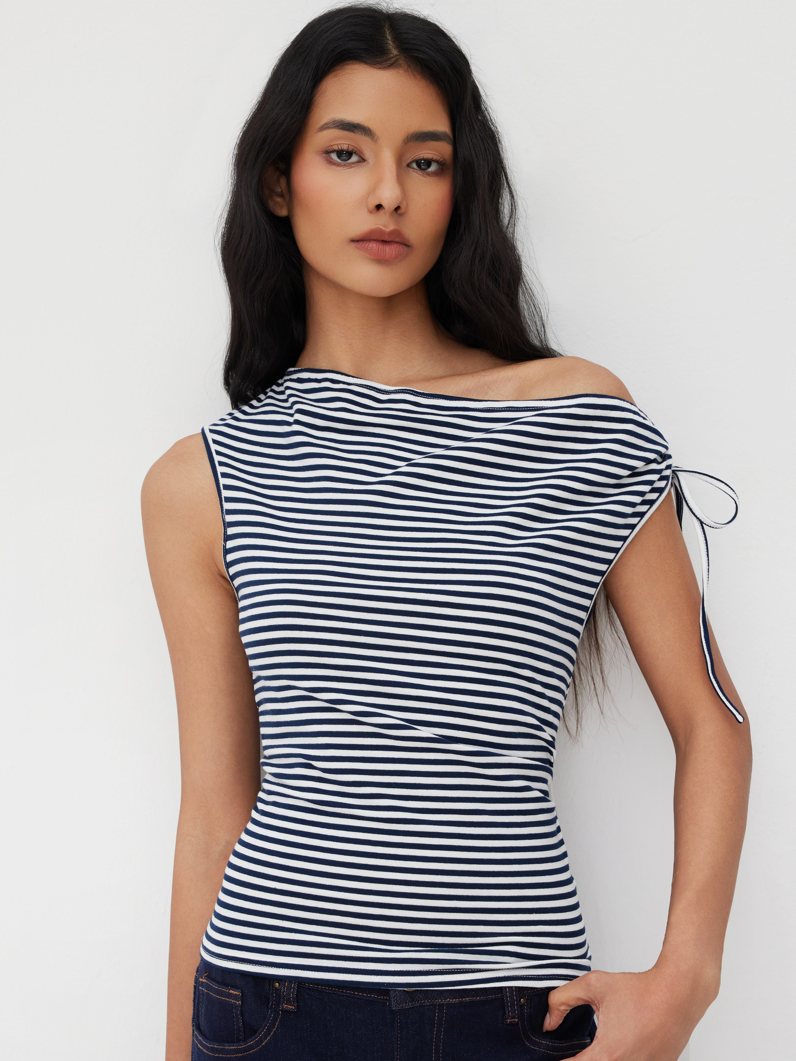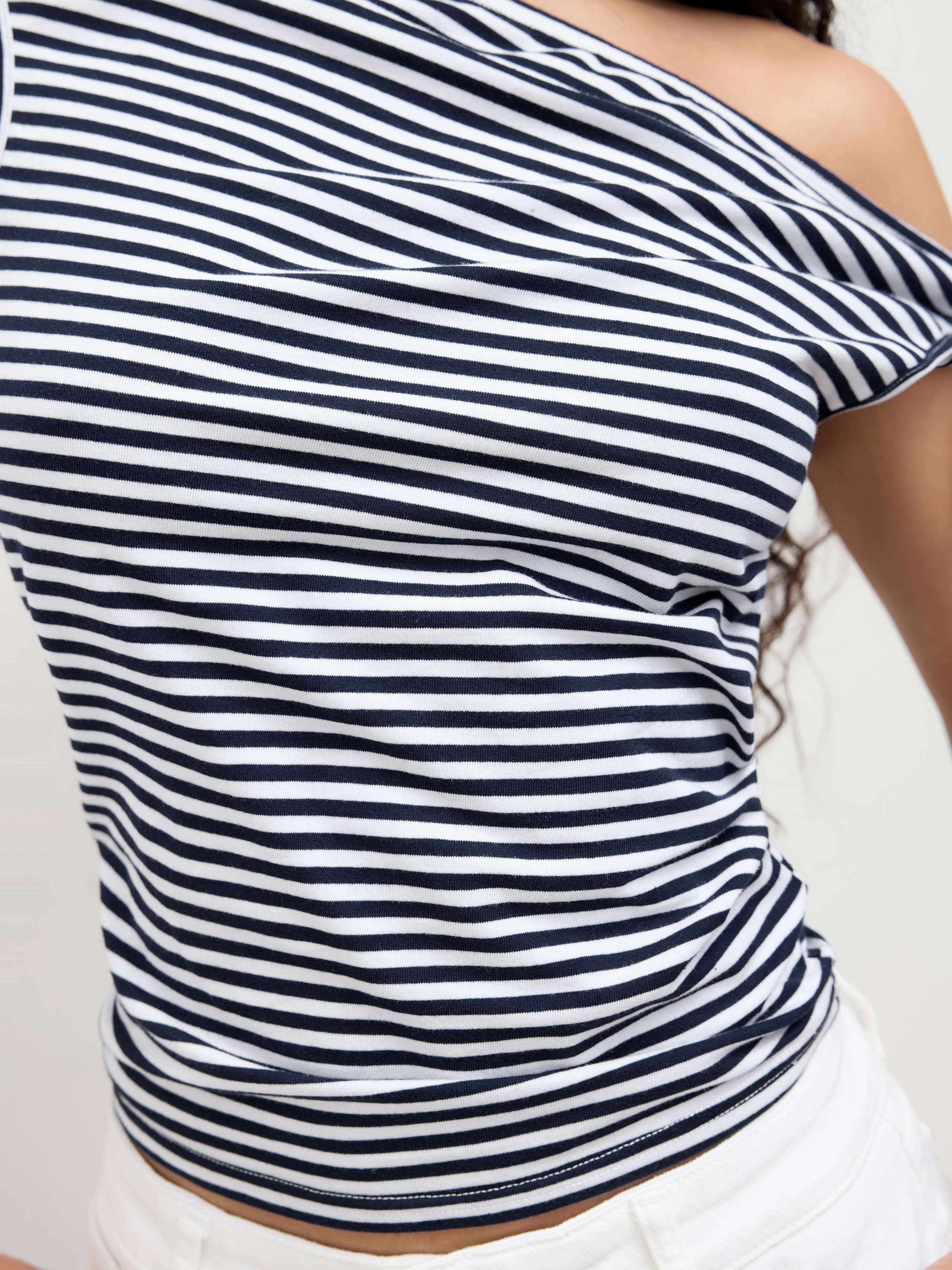 Cotton-blend Asymmetrical Neck Stripes Short Sleeve Tee