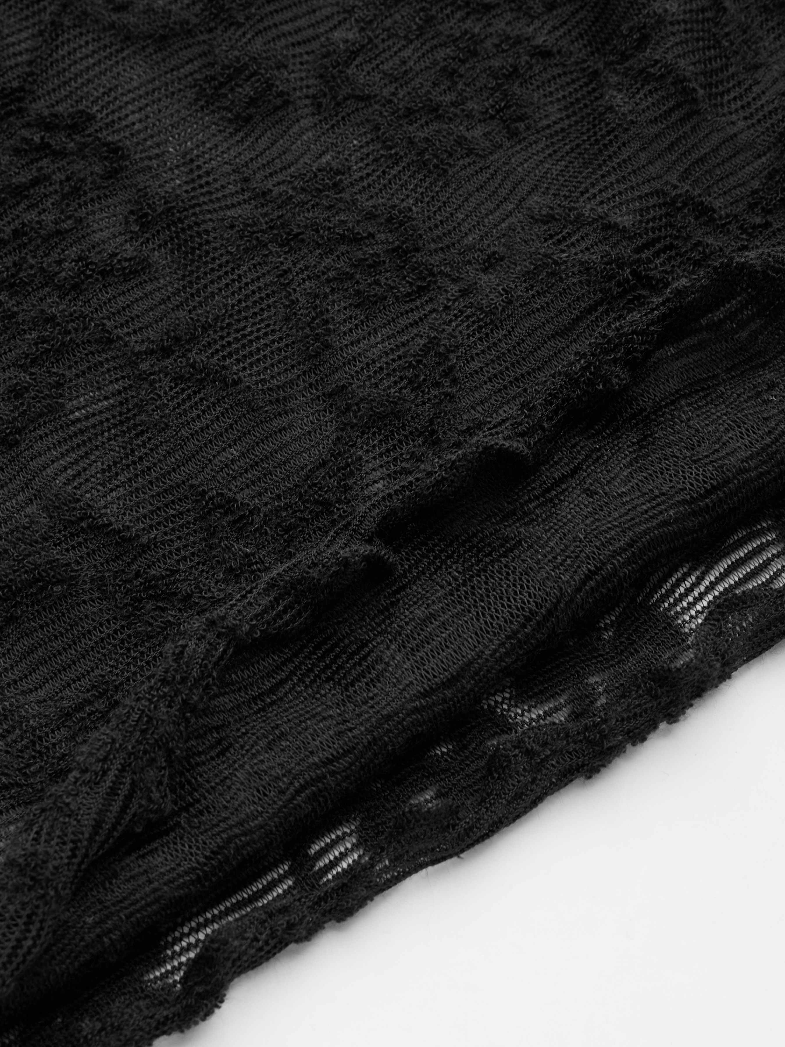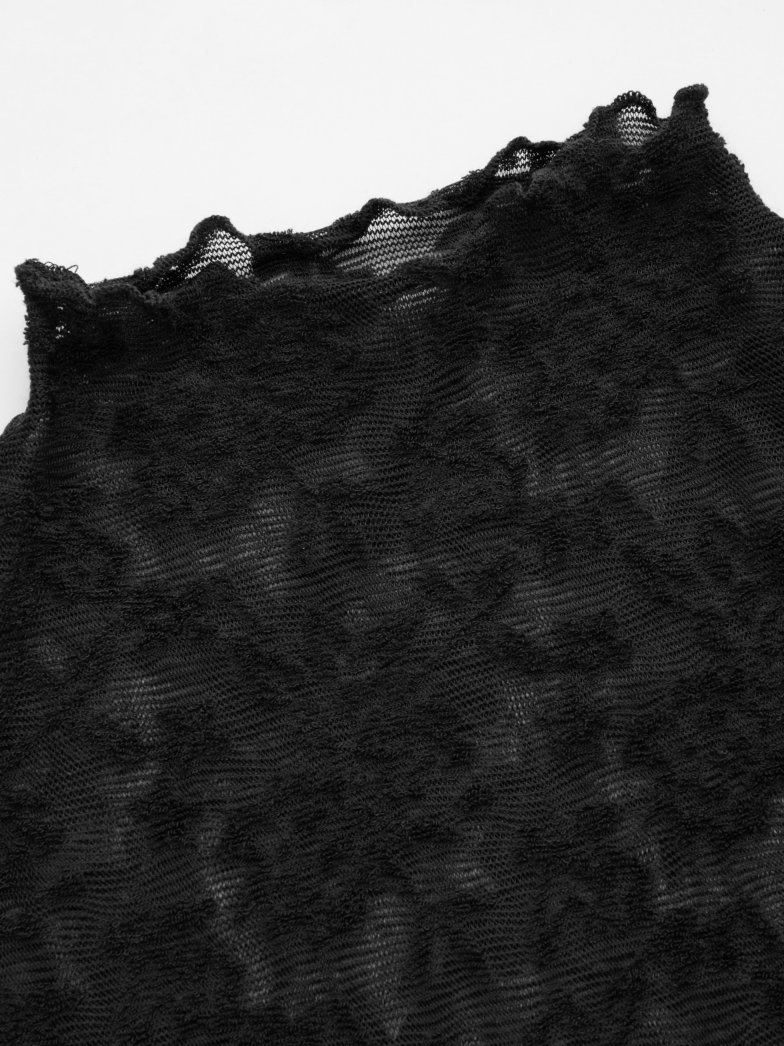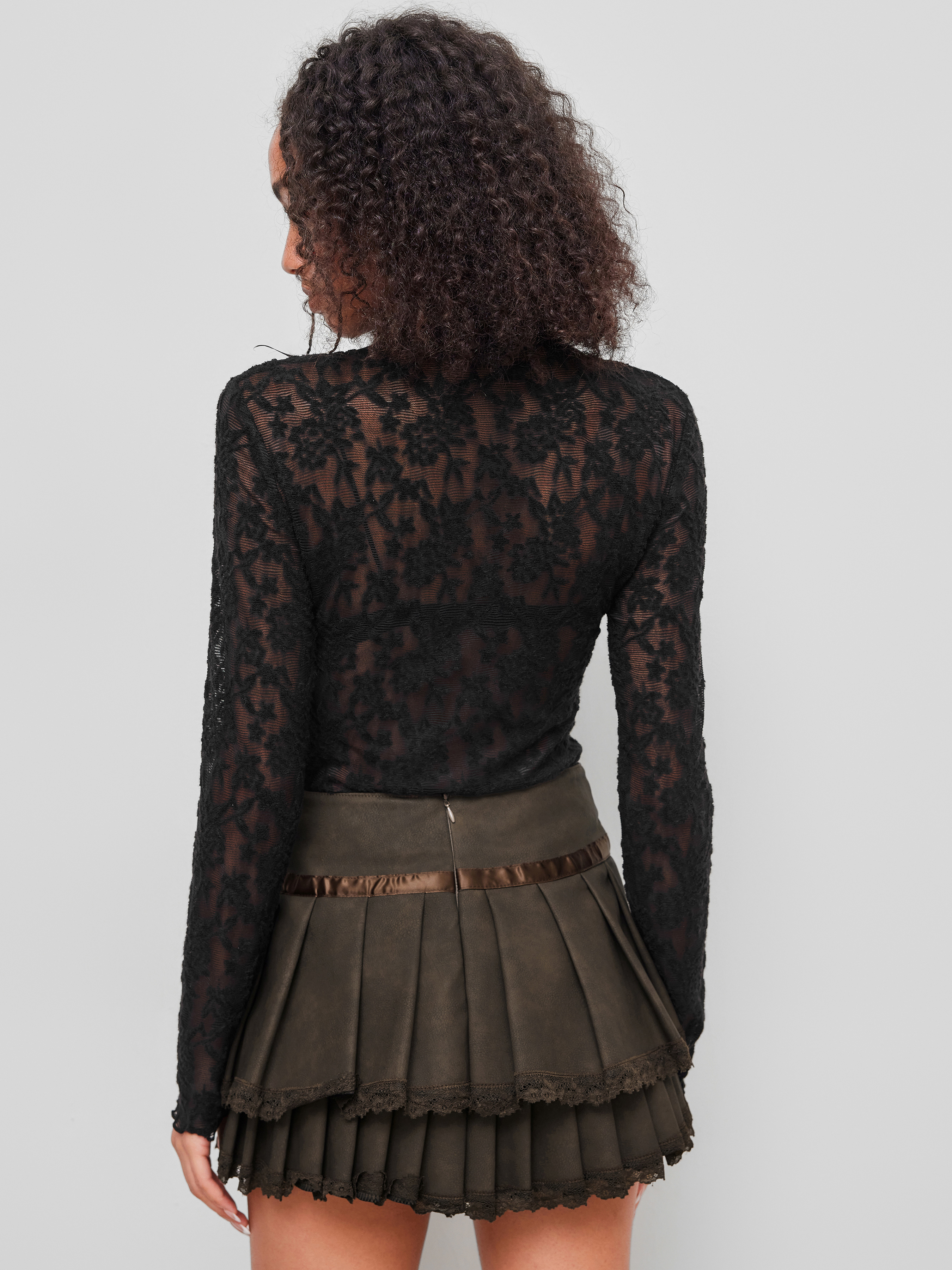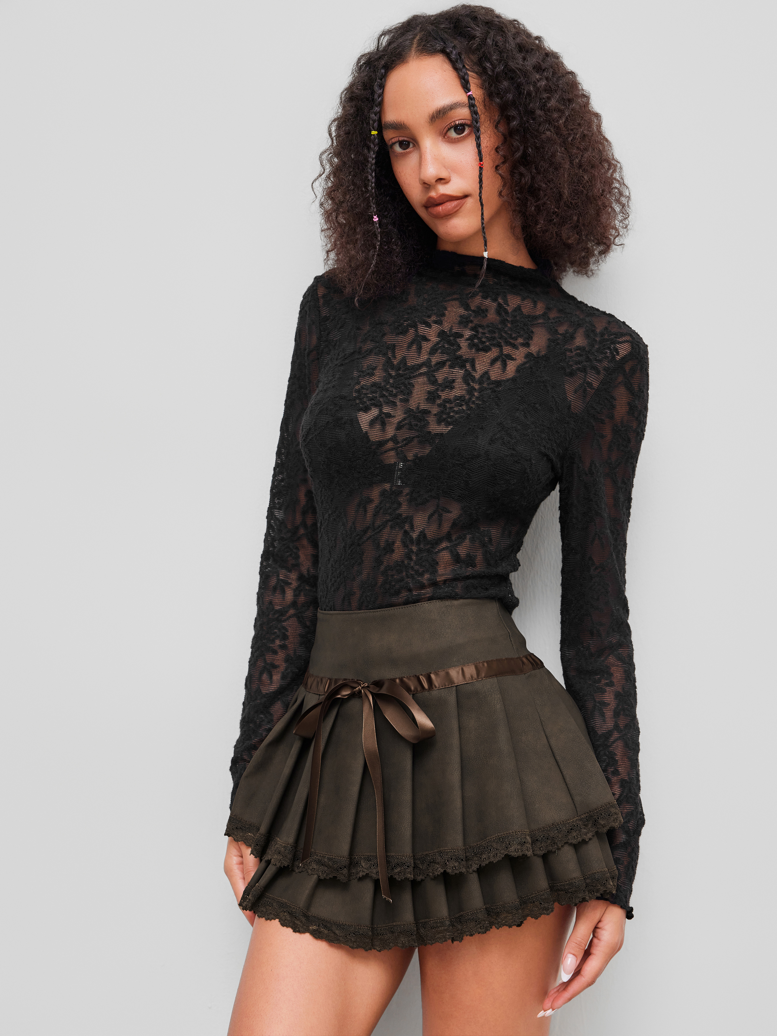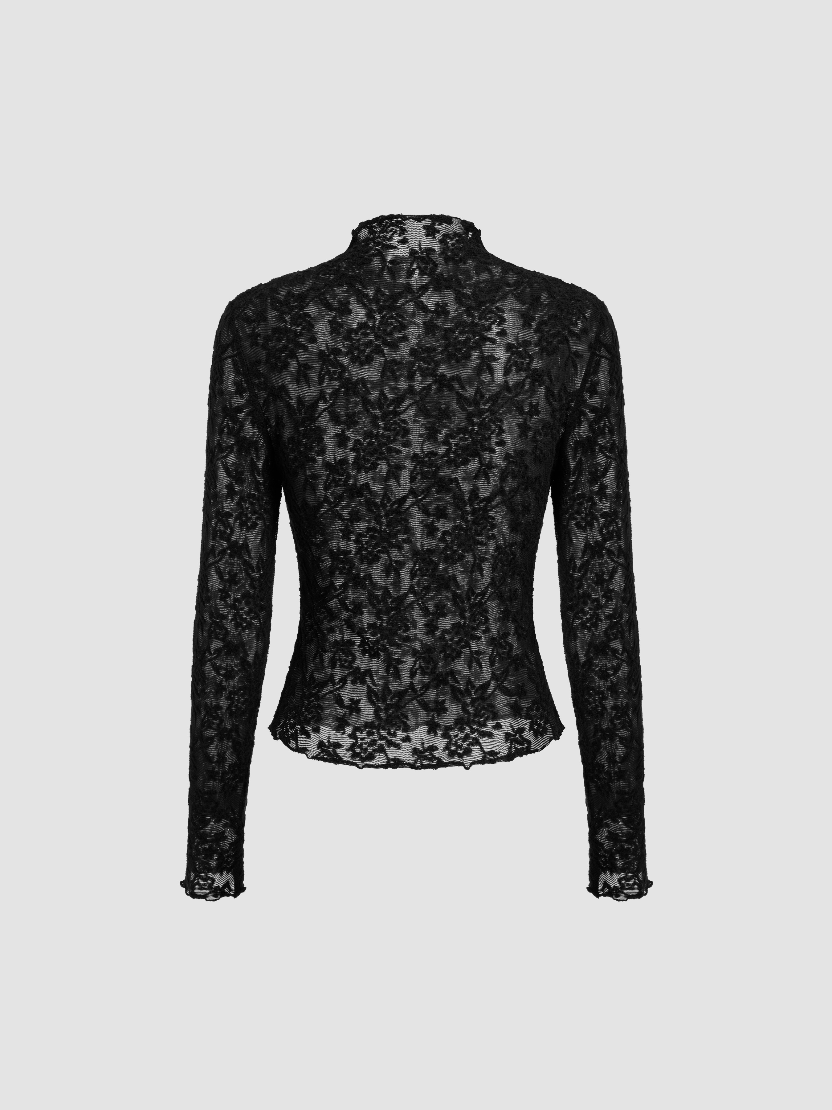 Lace High Neck Lettuce Trim Long Sleeve Top
