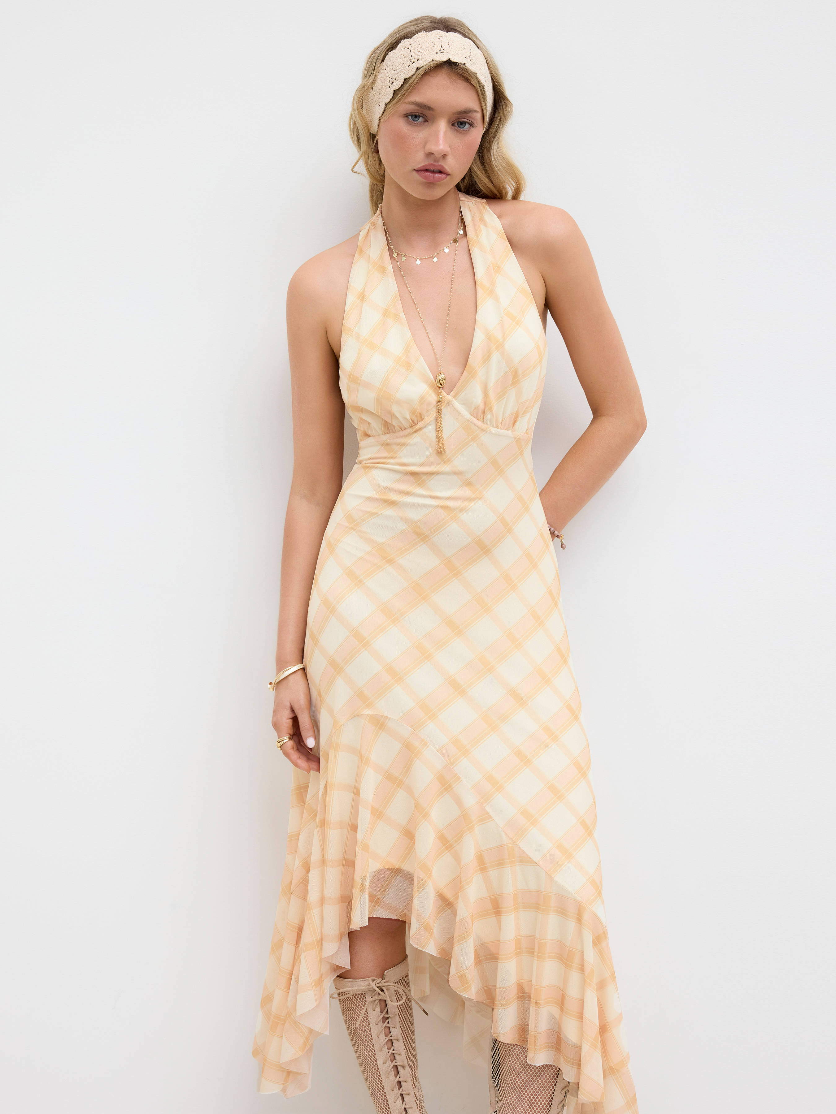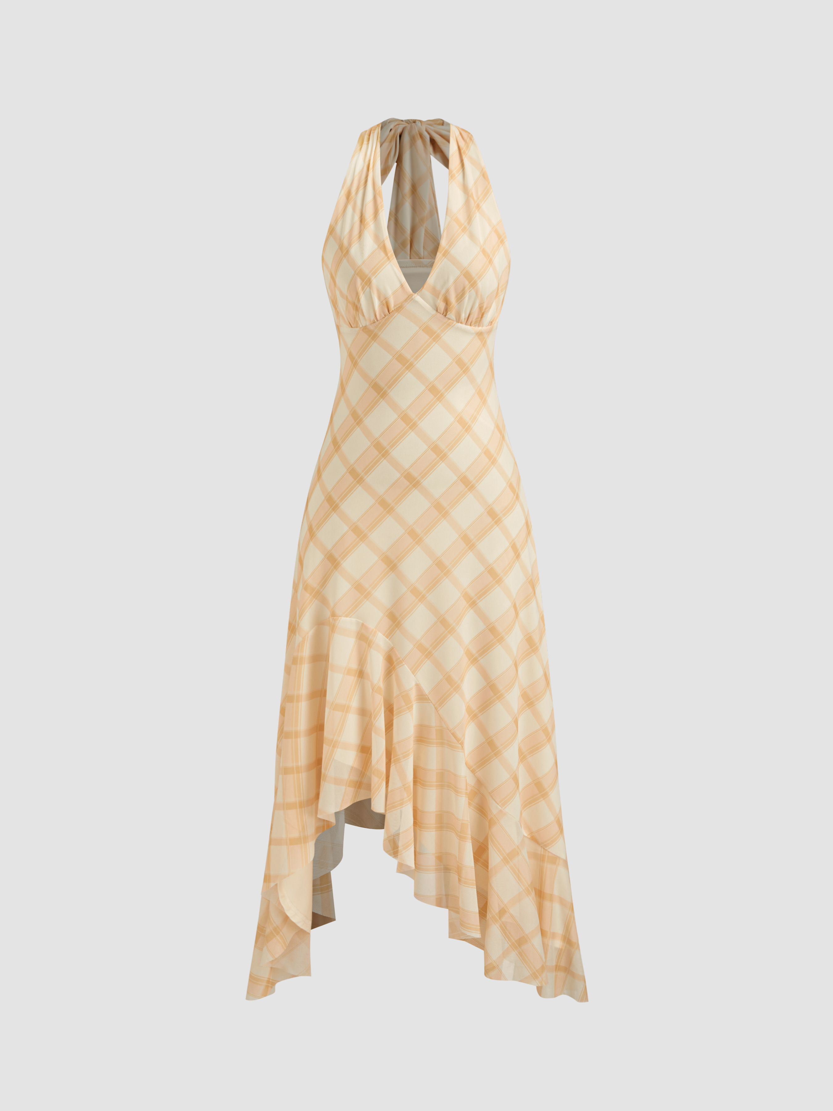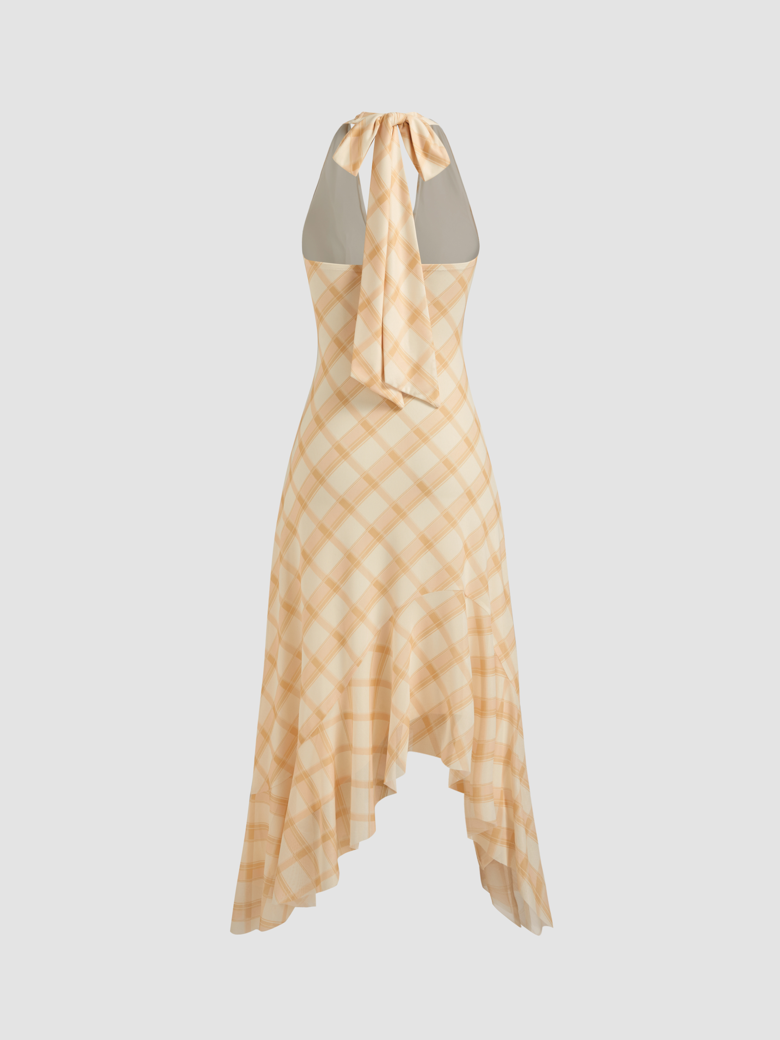 Mesh Halter Neckline Plaid Asymmetrical Ruffle Hem Midi Dress
