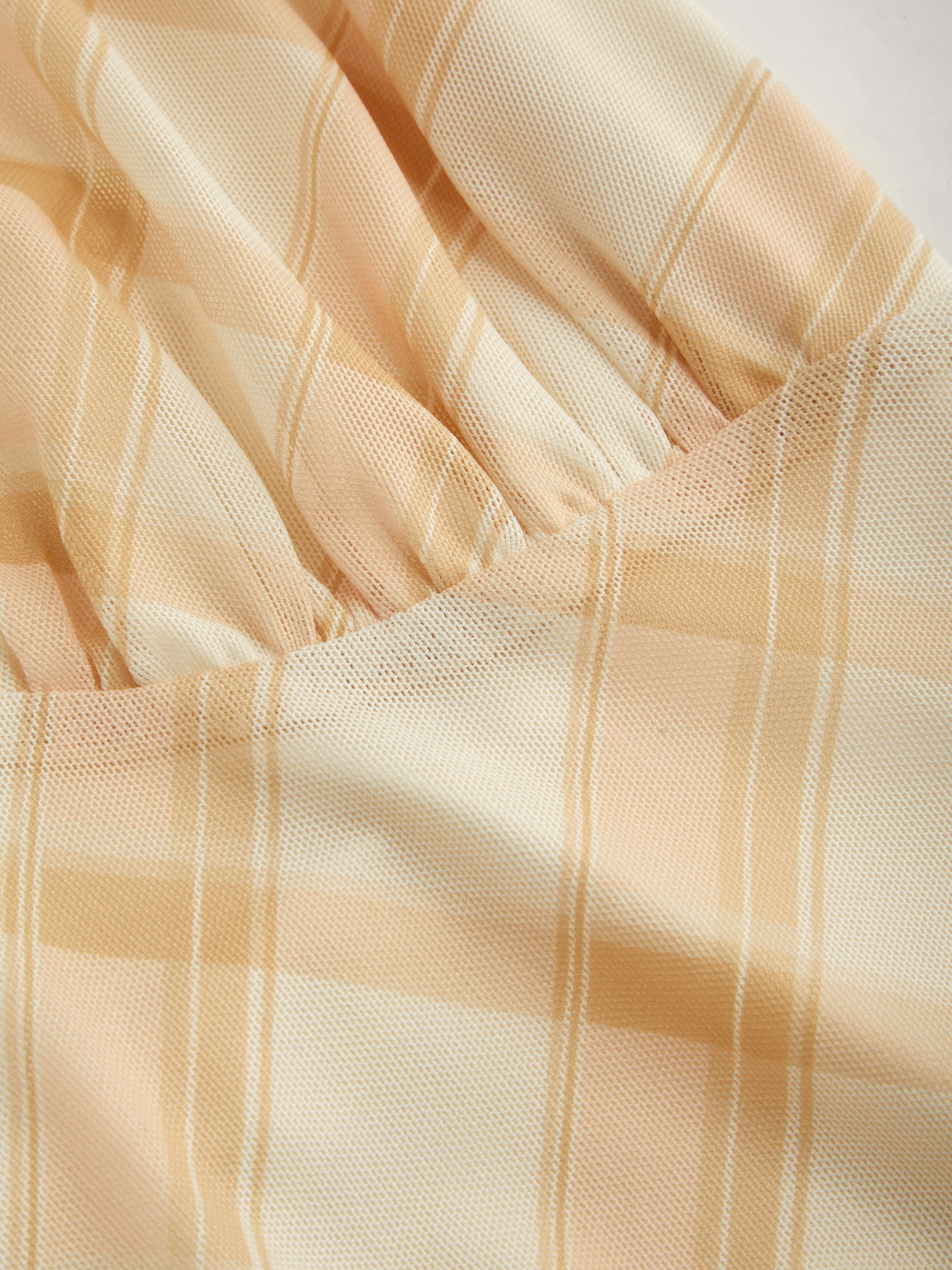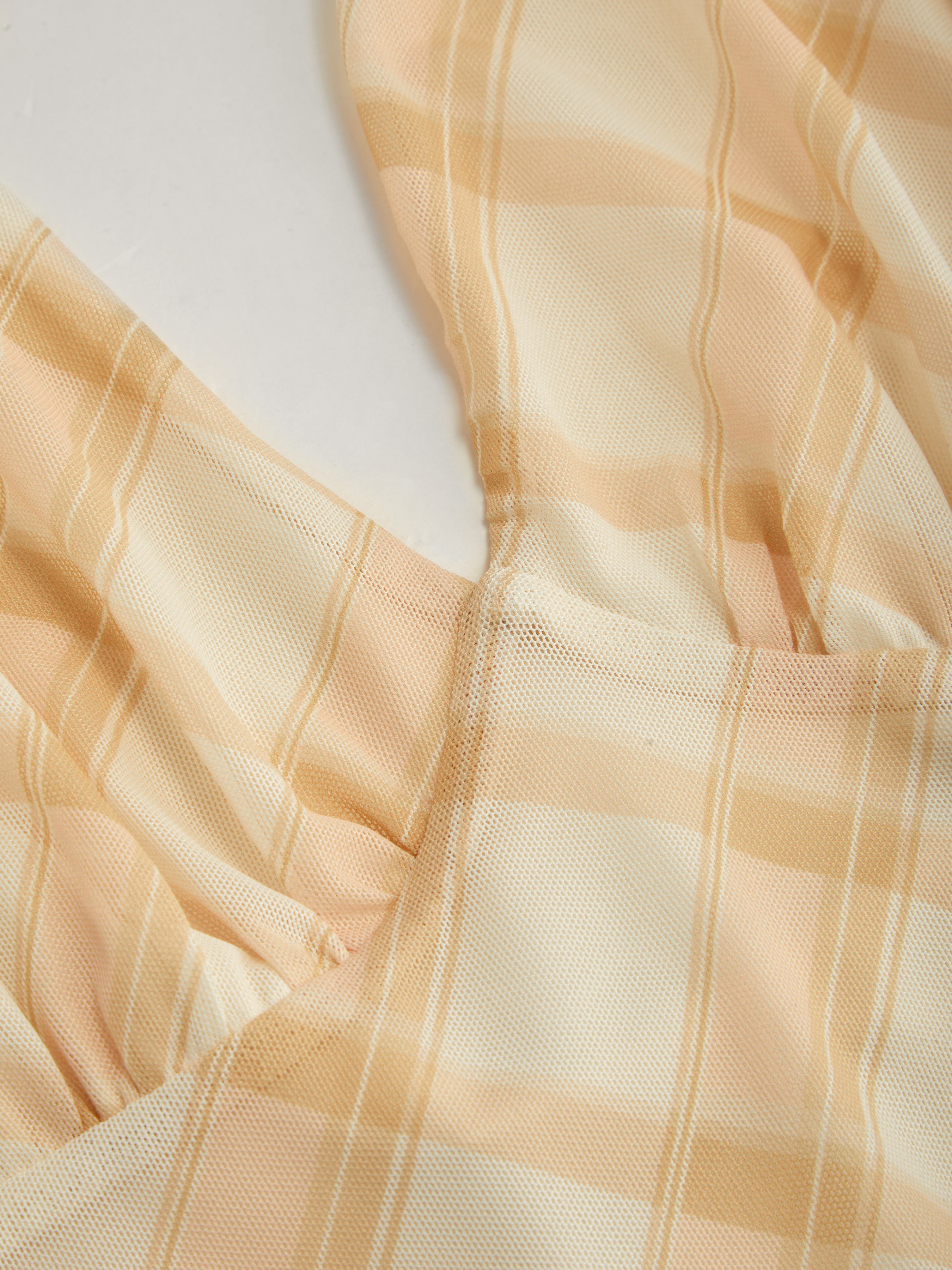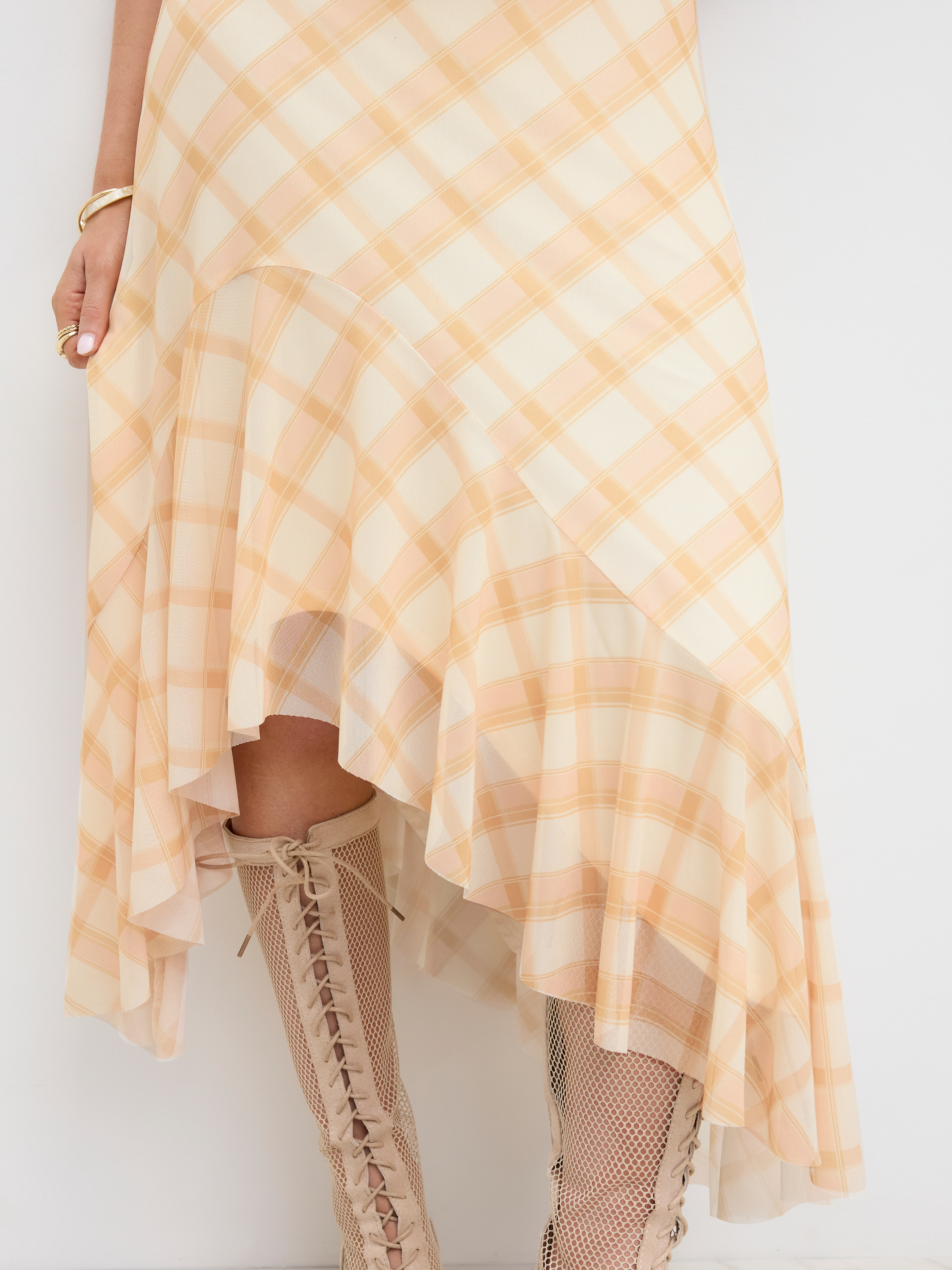 Mesh Halter Neckline Plaid Asymmetrical Ruffle Hem Midi Dress