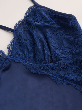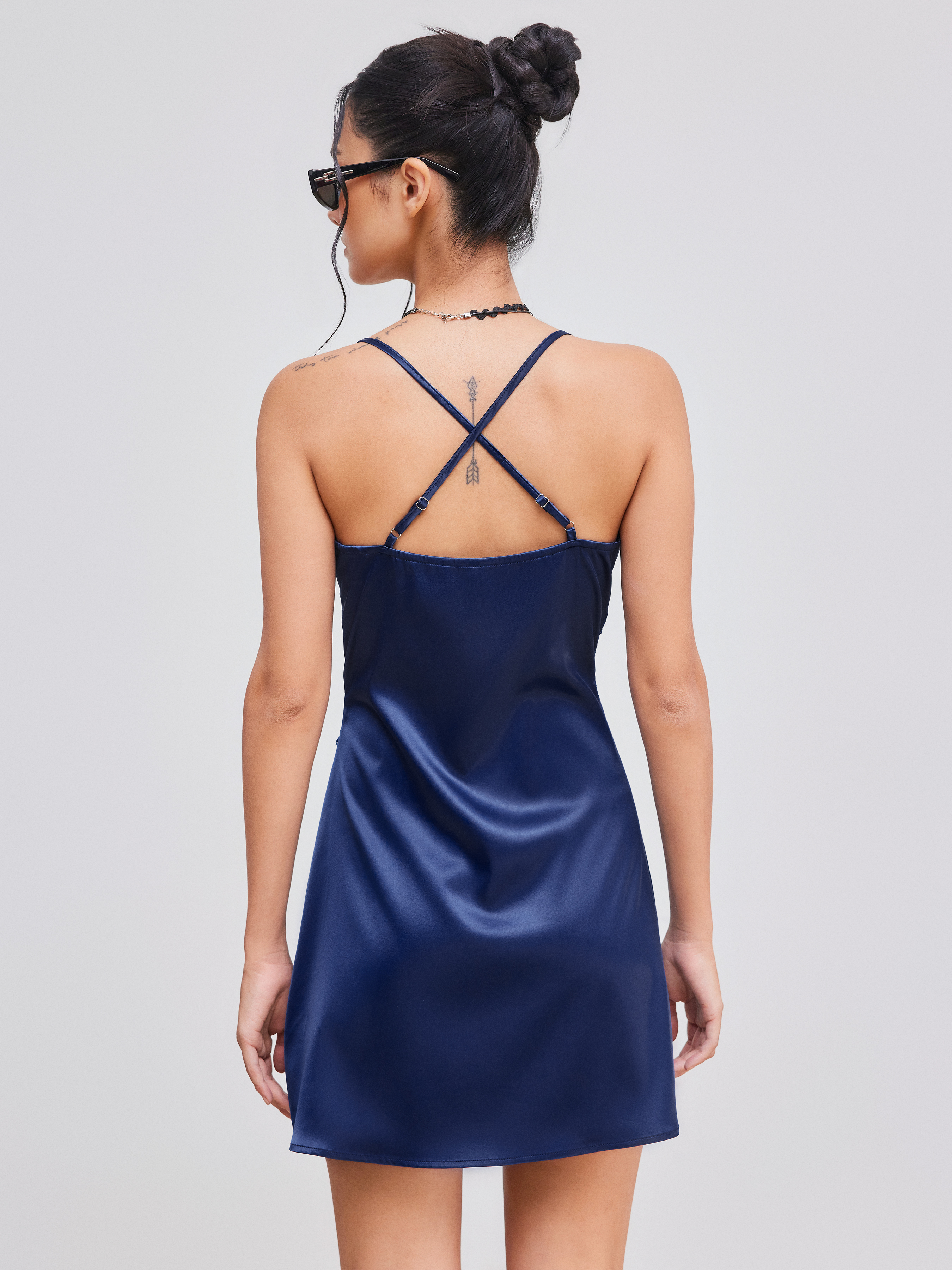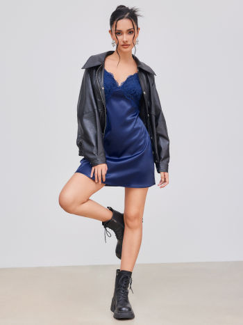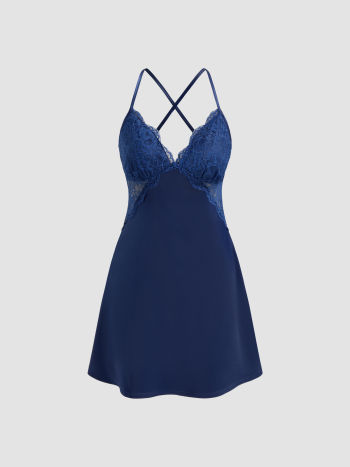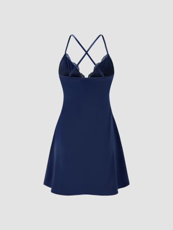 Satin V-neck Solid Criss Cross Lace Mini Dress