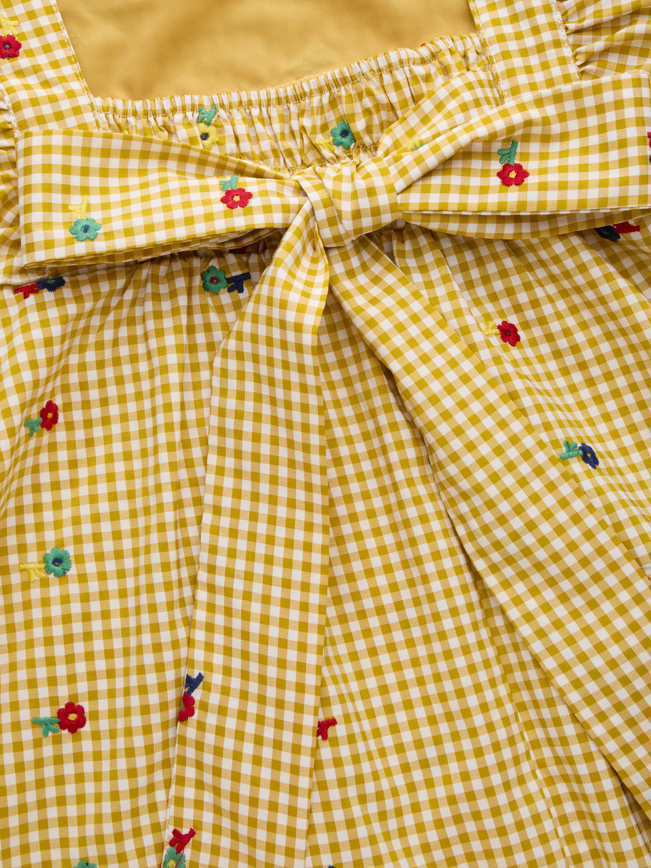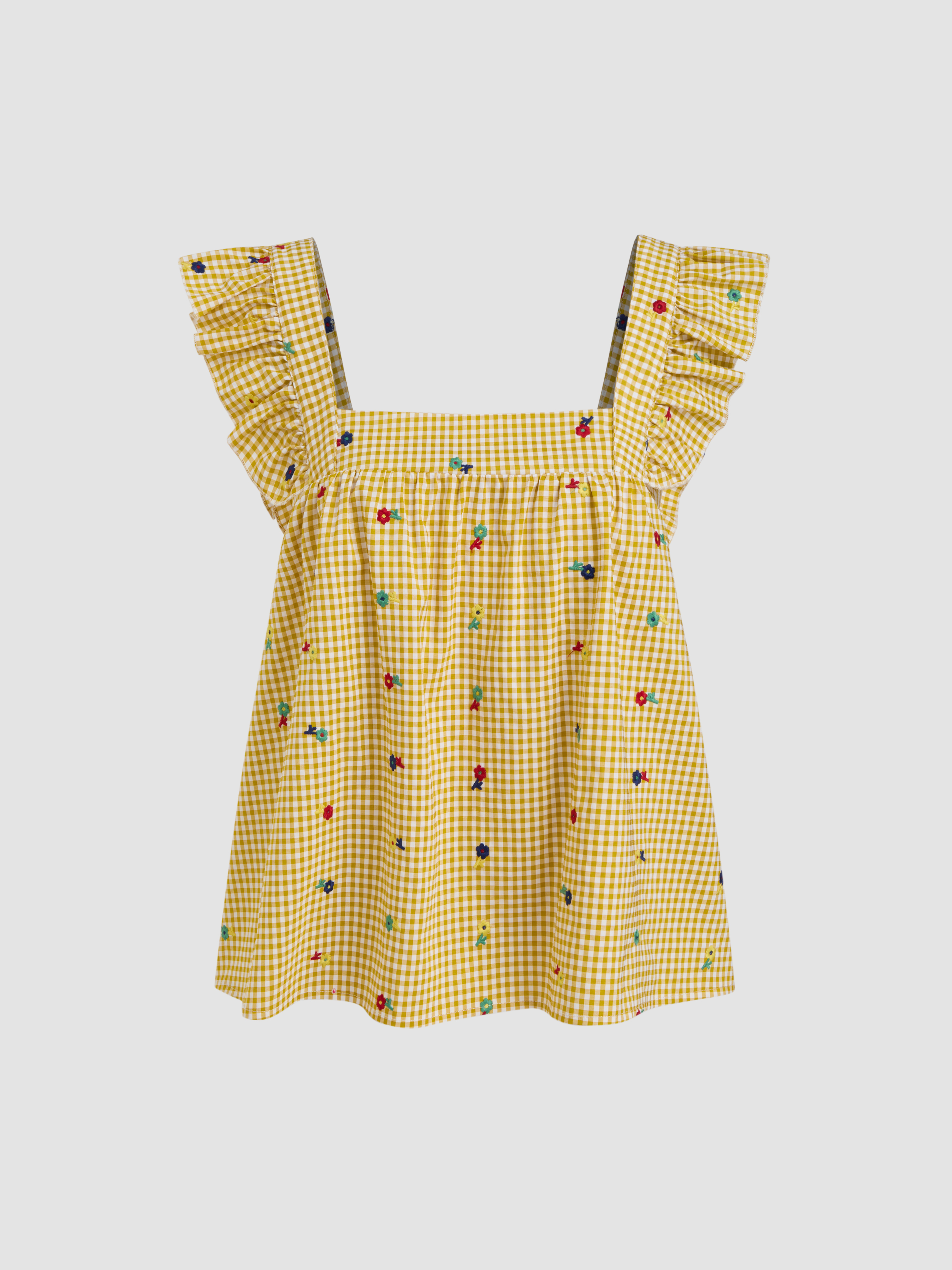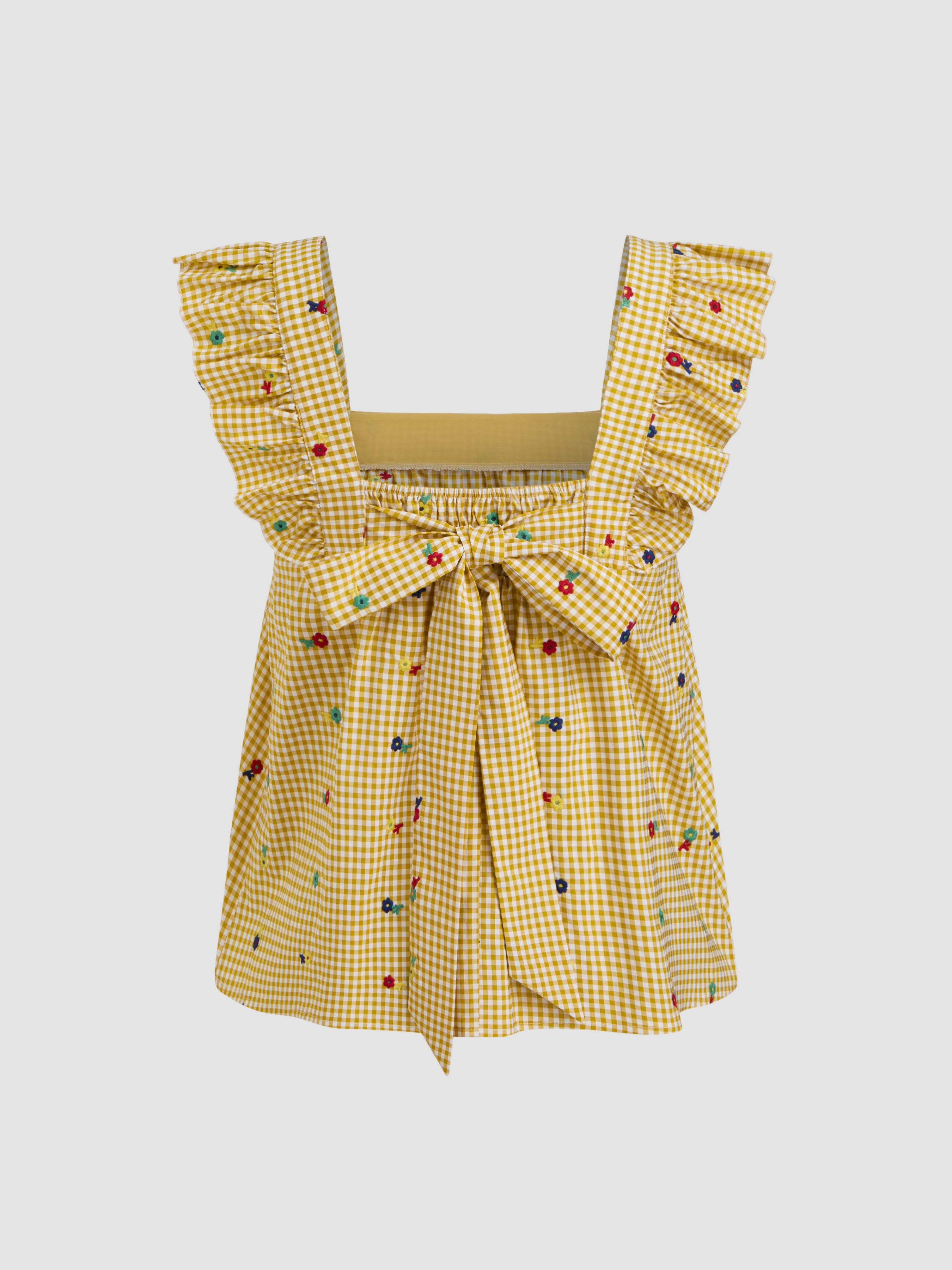 Gingham Floral Embroidery Ruffle Hem Bowknot Tank Top