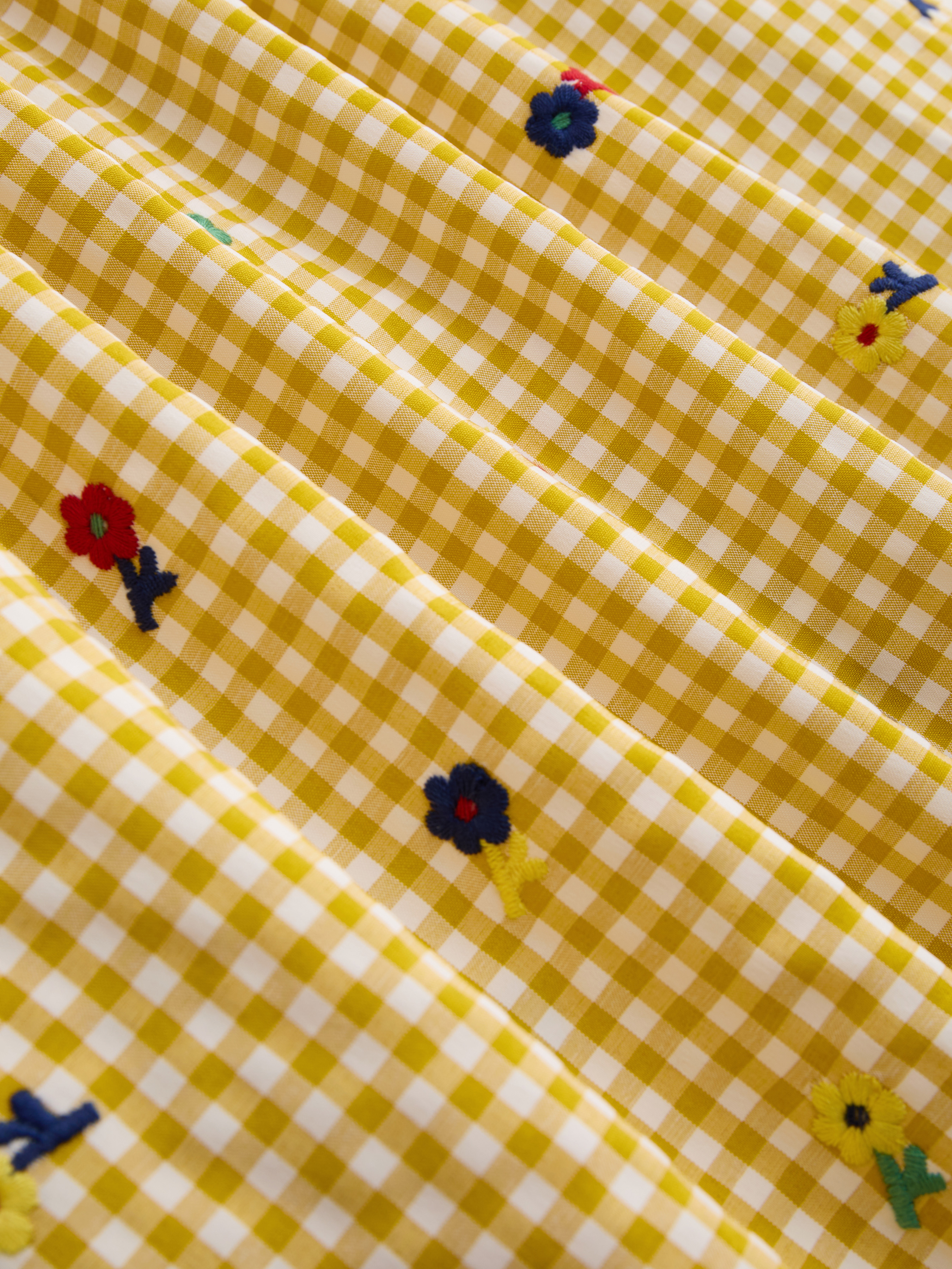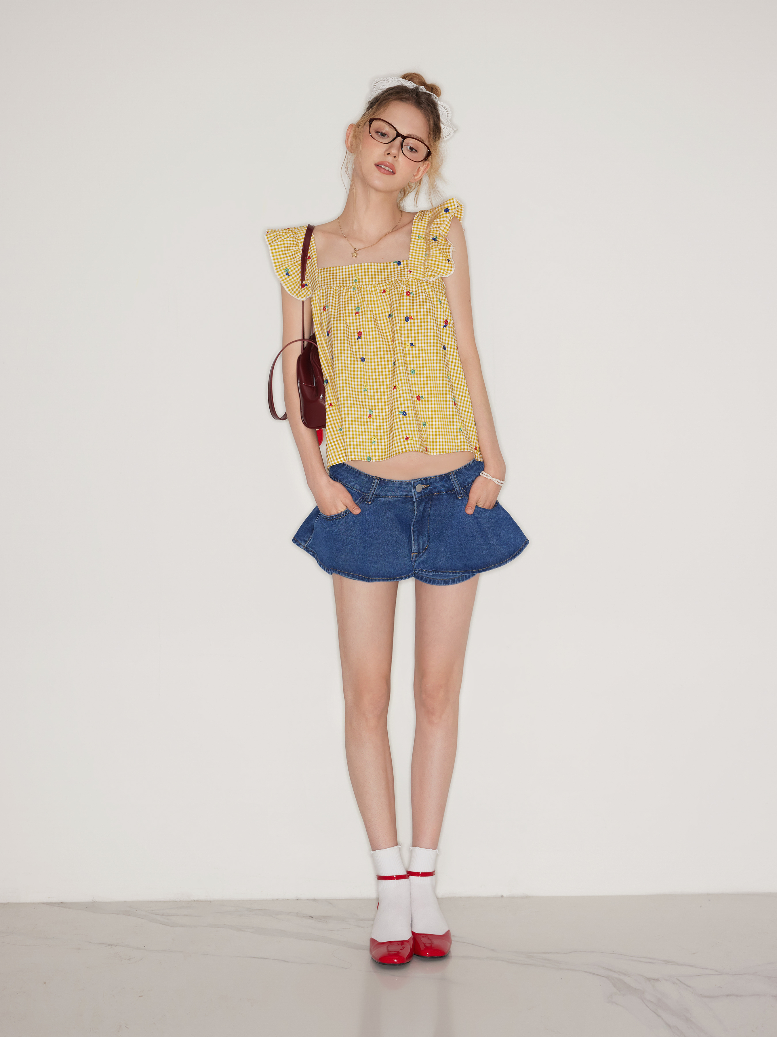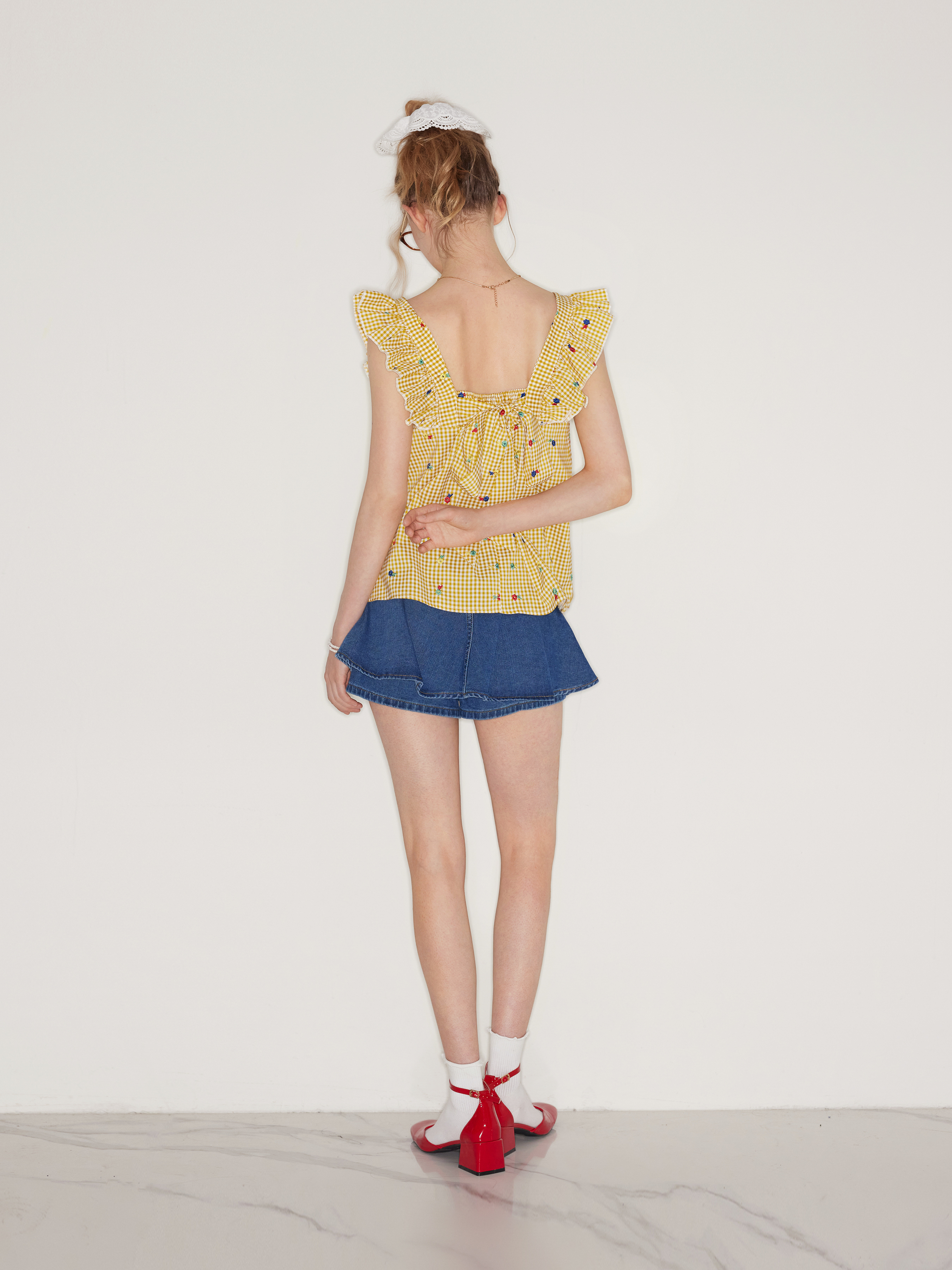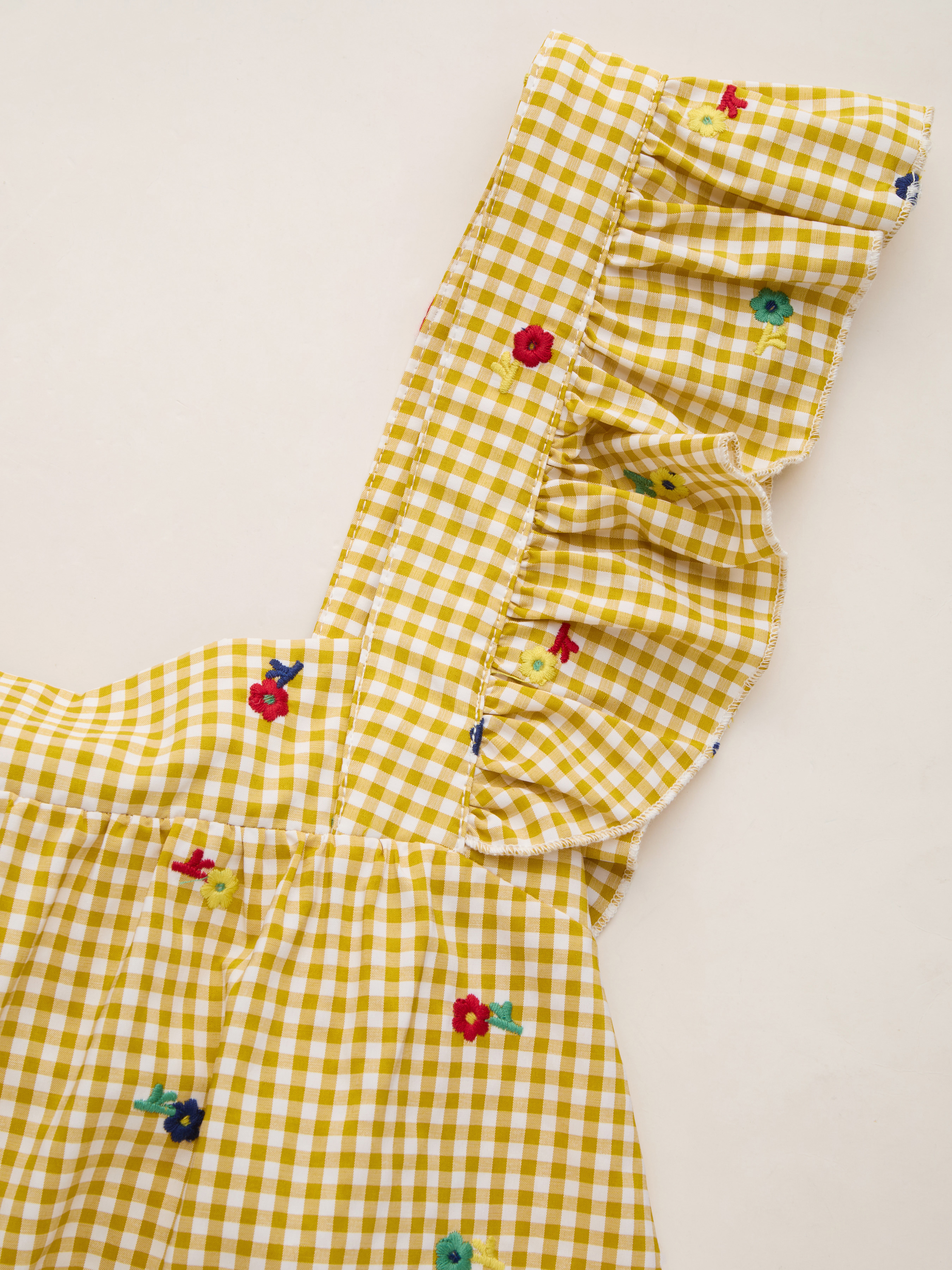 Gingham Floral Embroidery Ruffle Hem Bowknot Tank Top