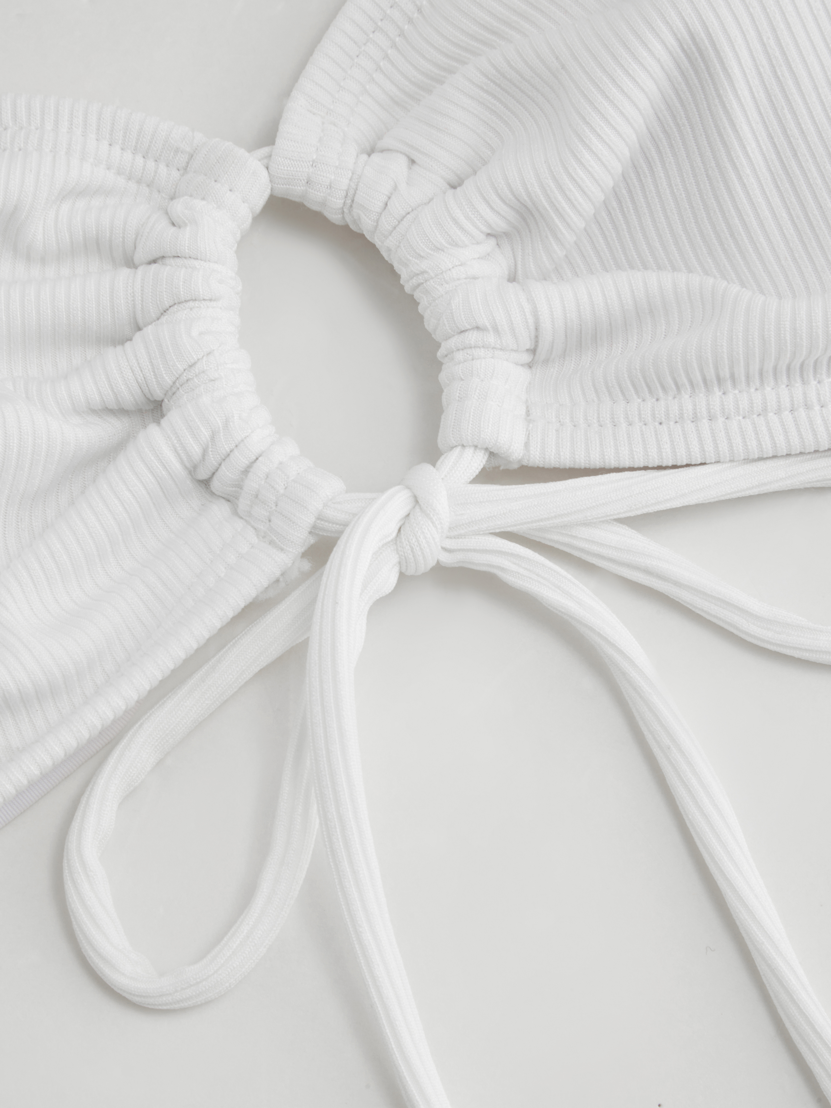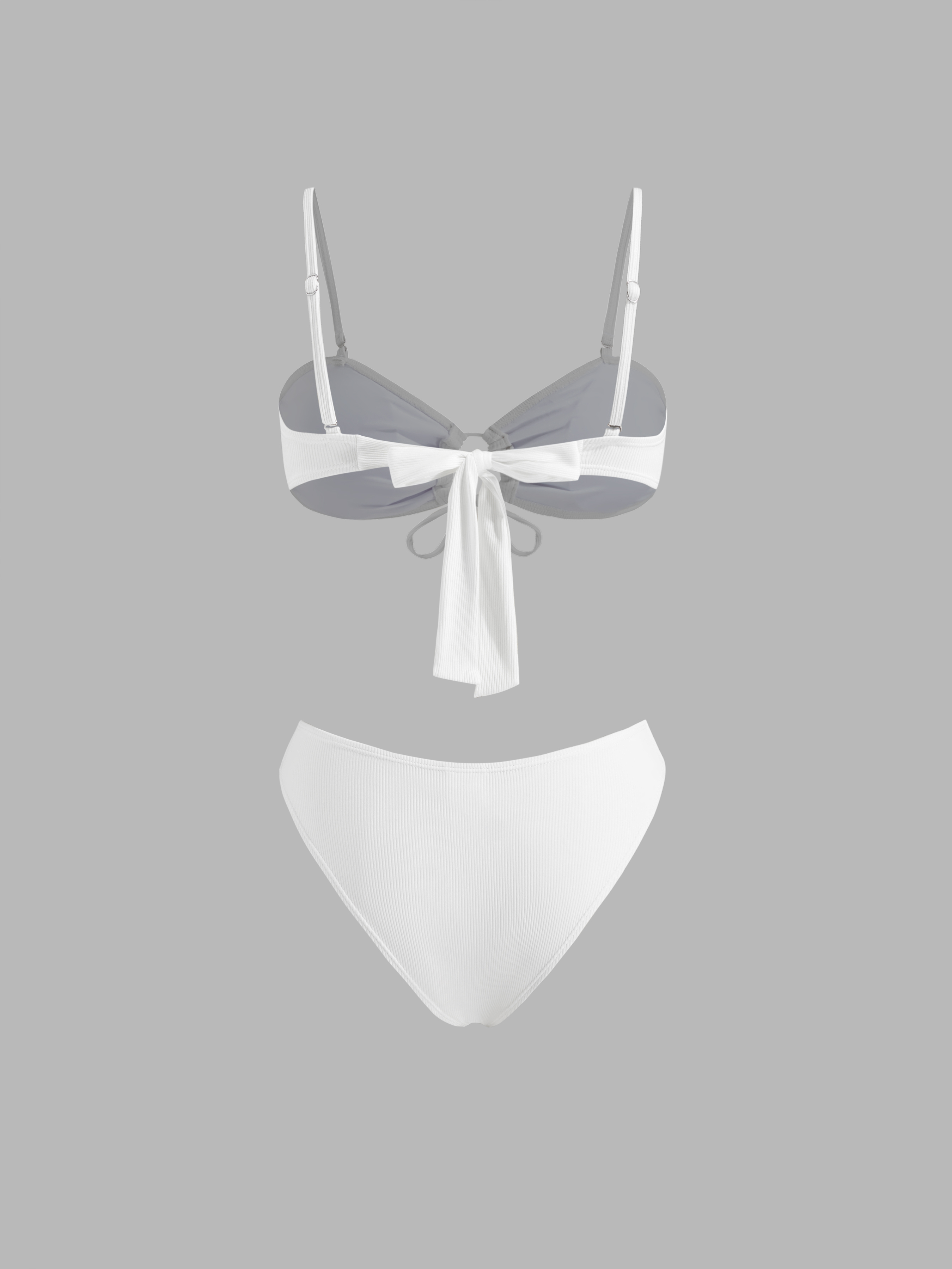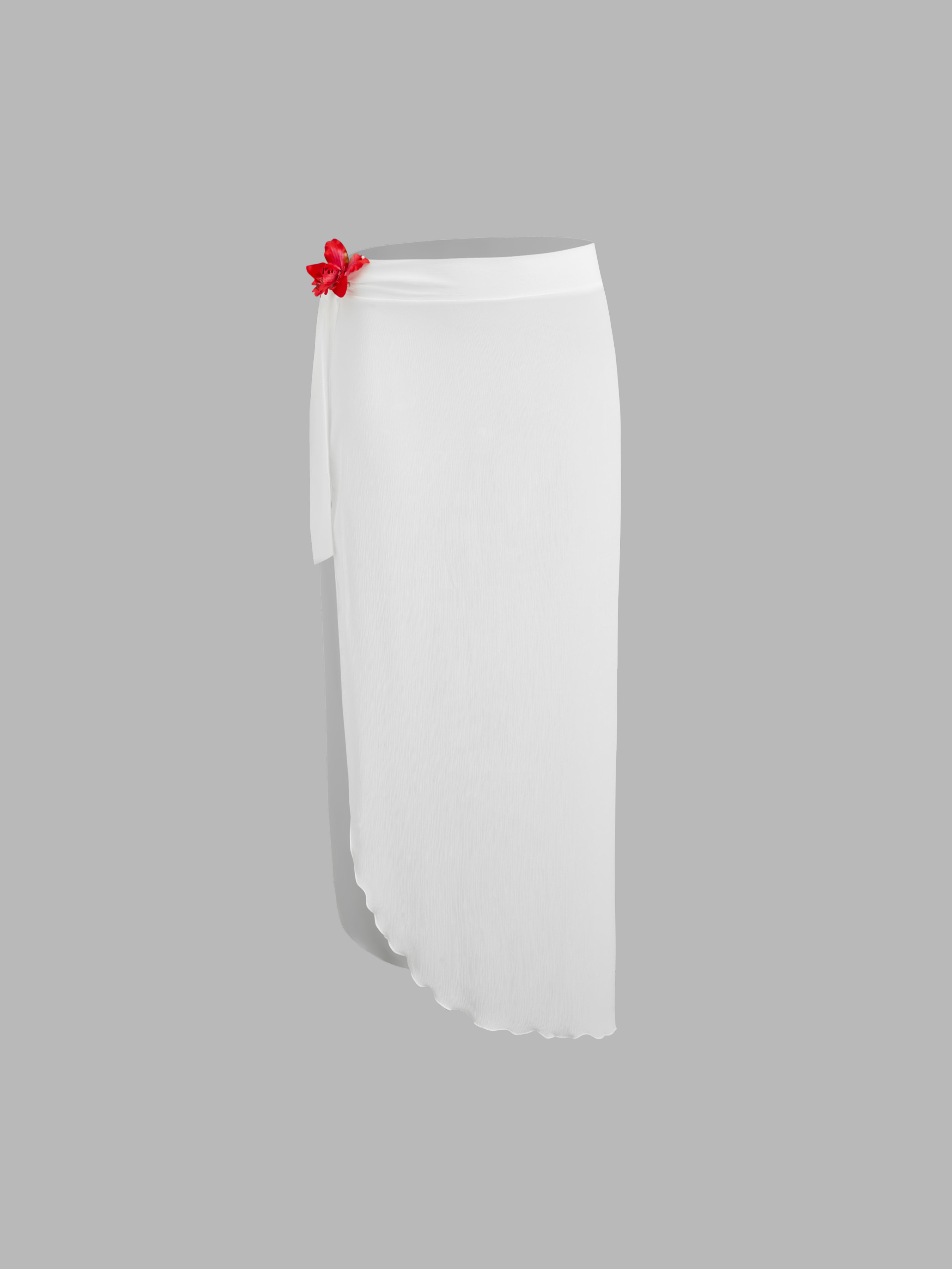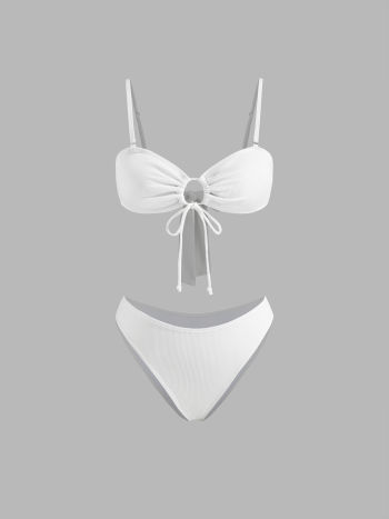 V-neck Cut Out Knotted Bandeau Cheeky Bikini Set With Flower Sarong
