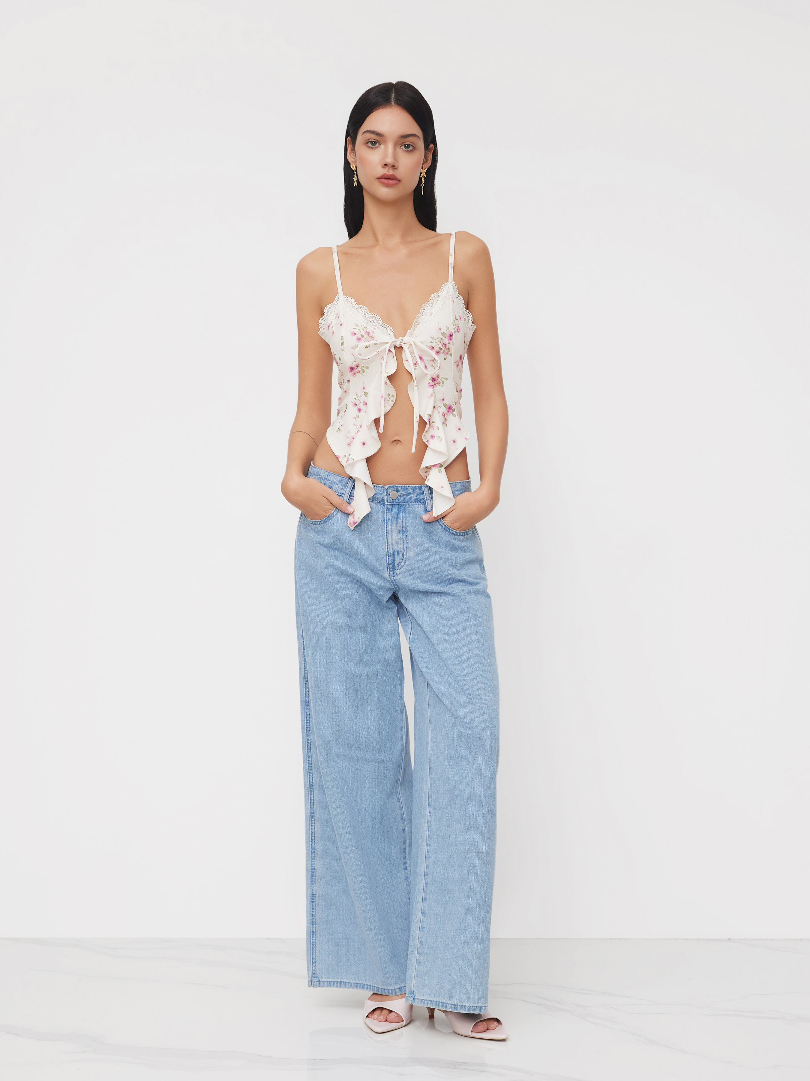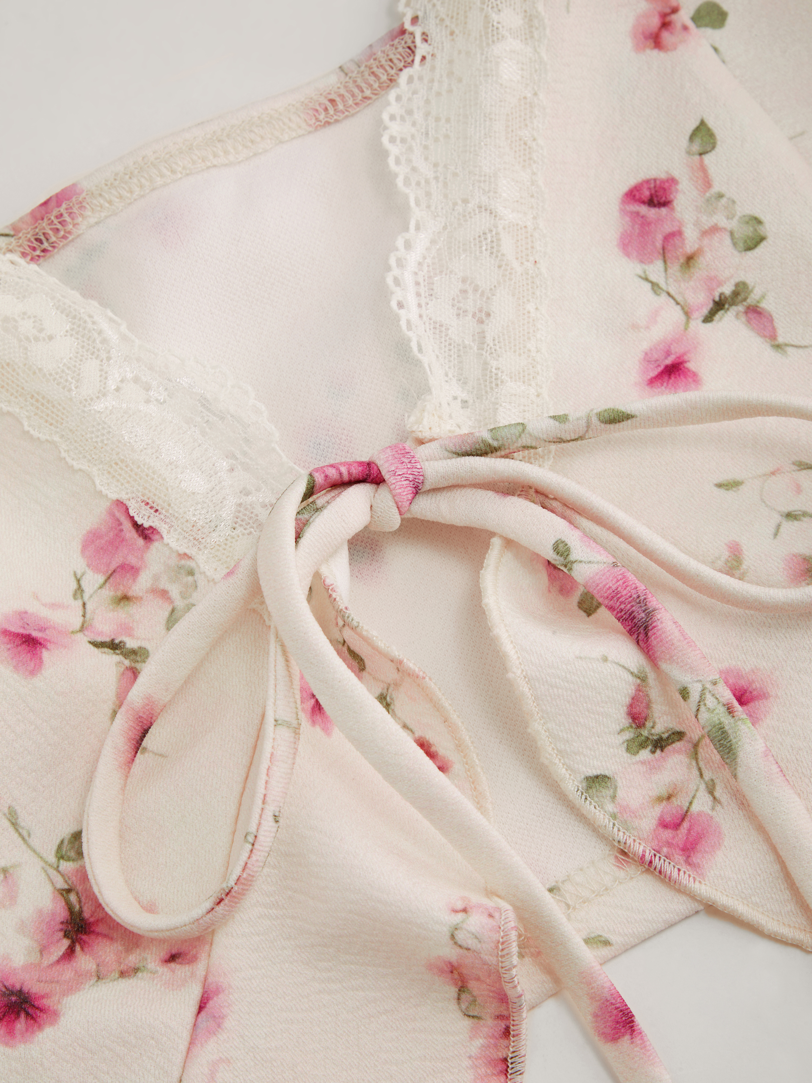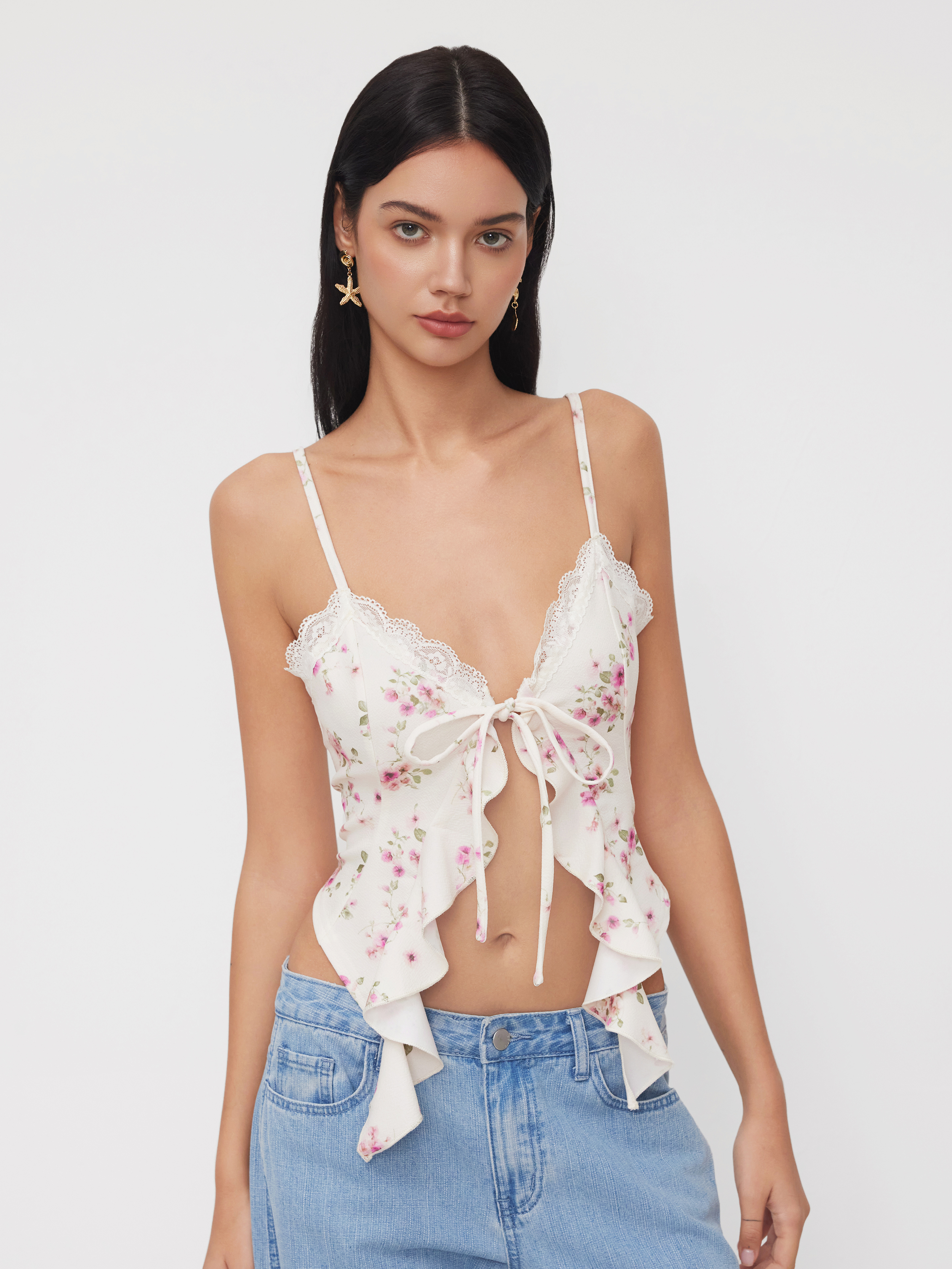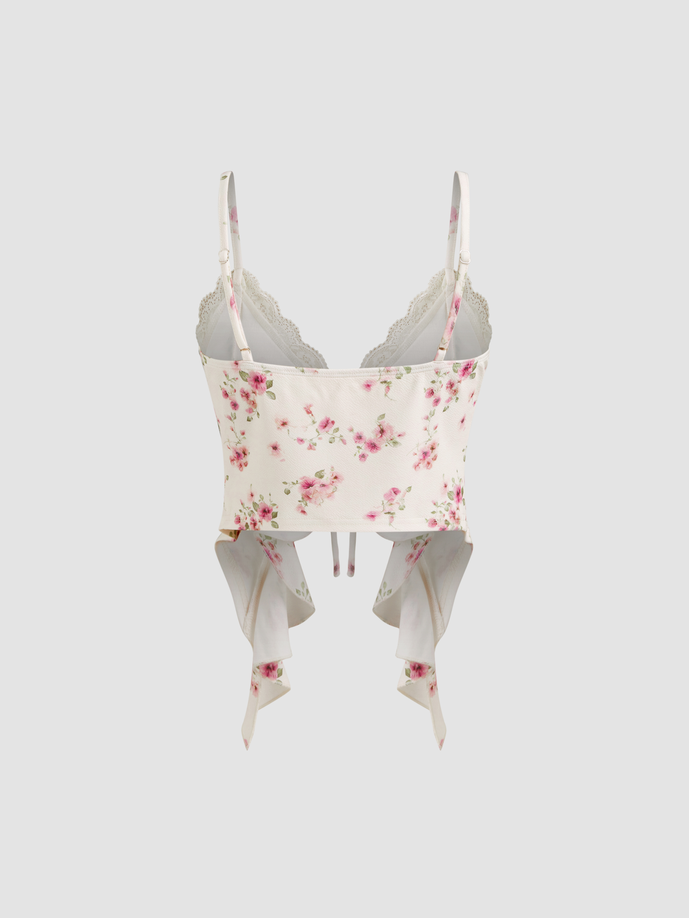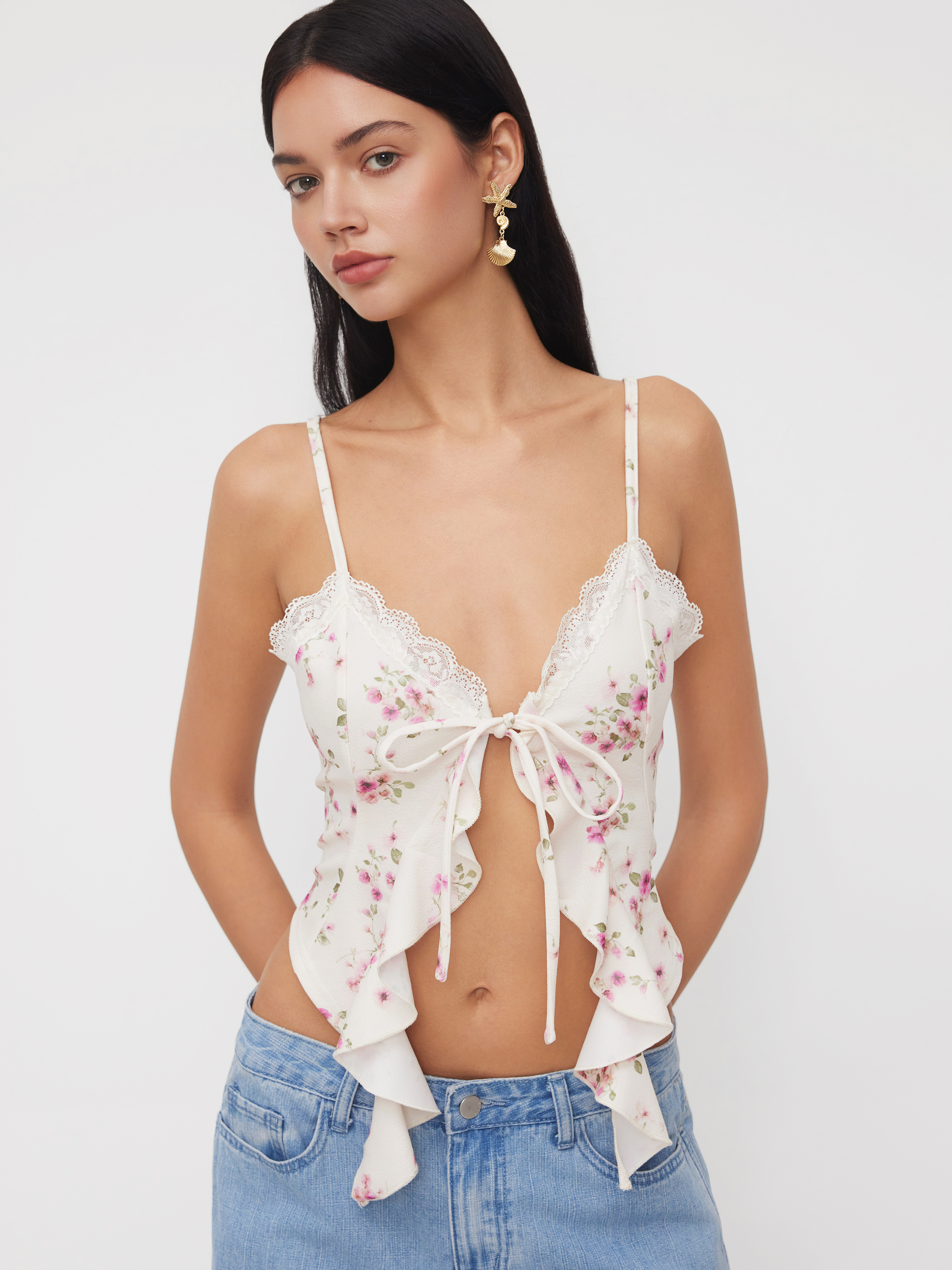 V-neck Floral Knotted Ruffle Hem Cami Top