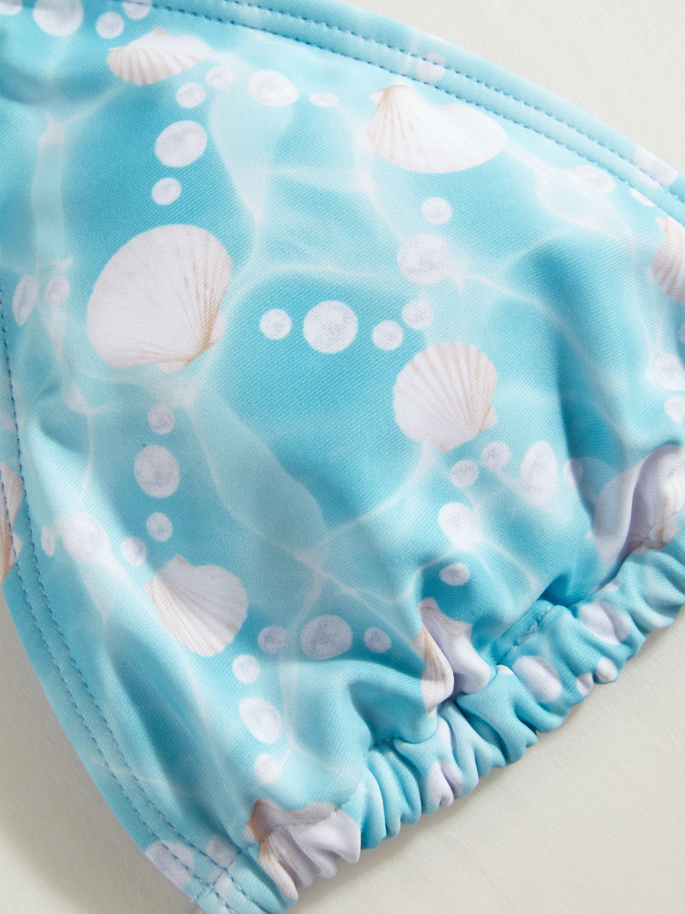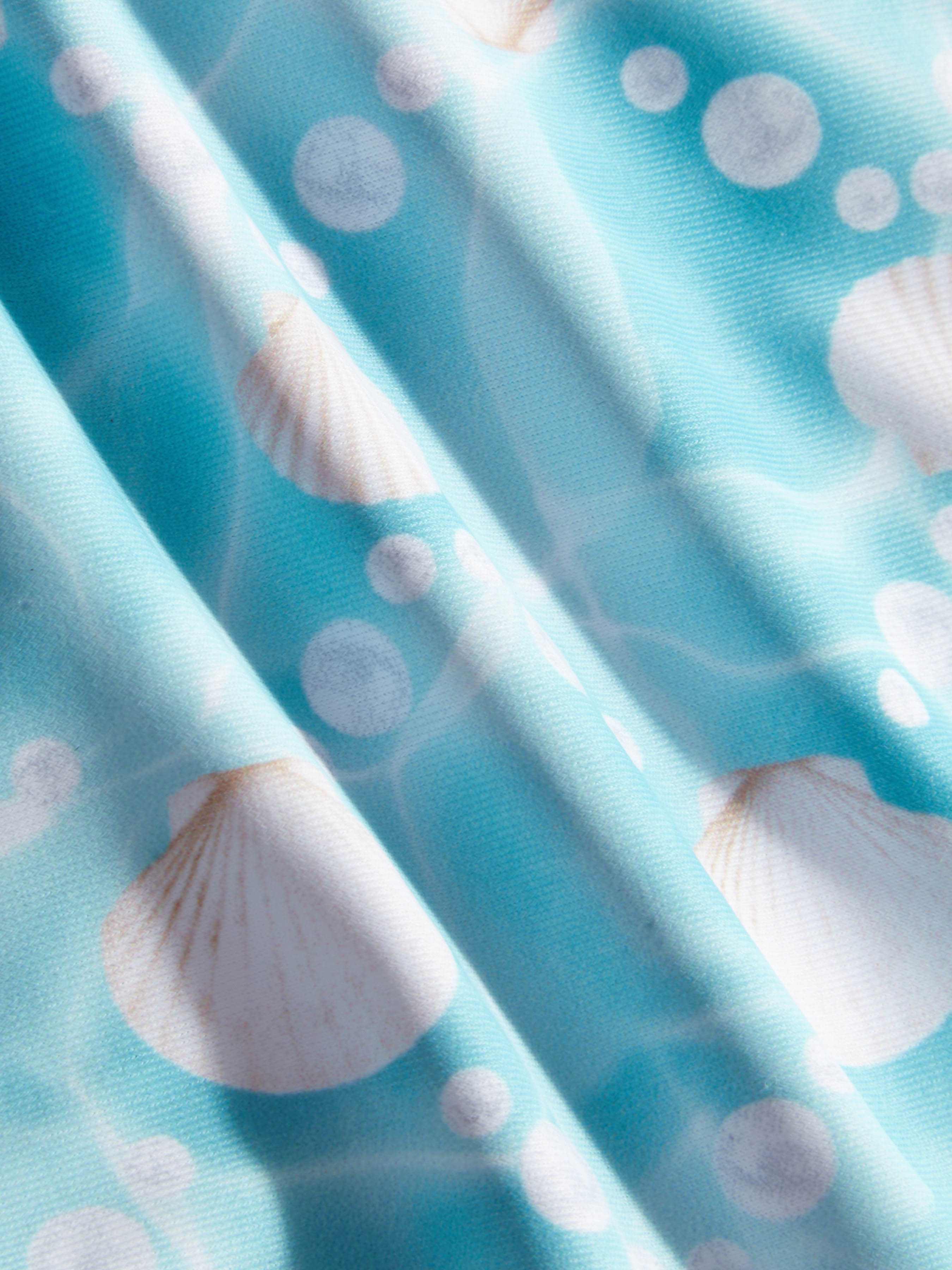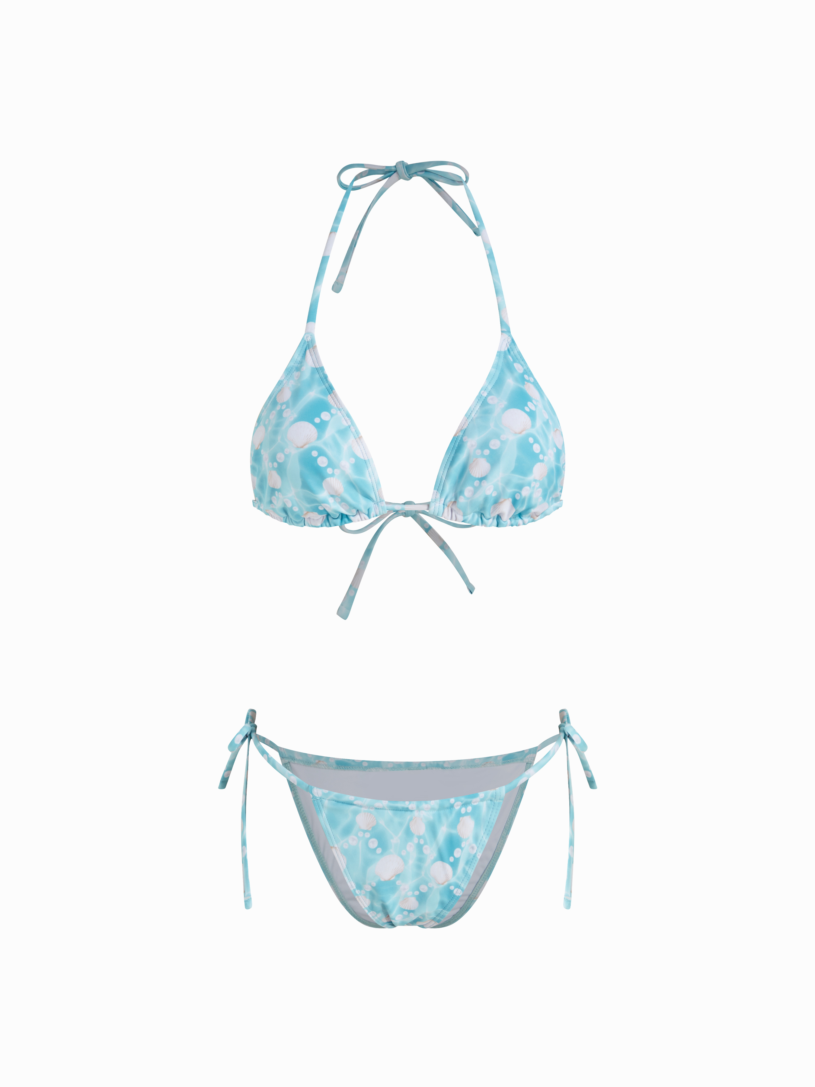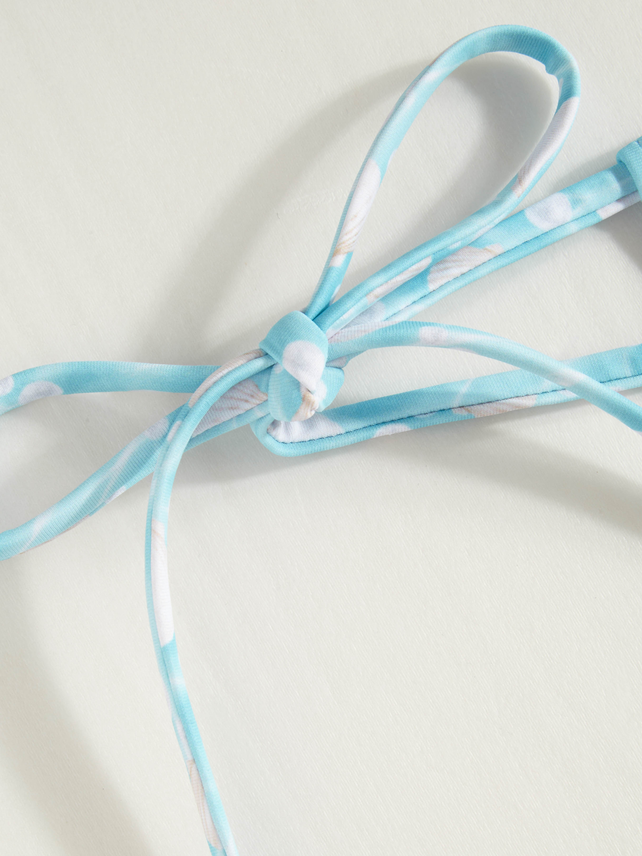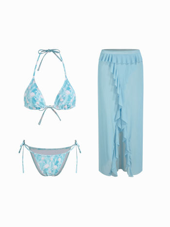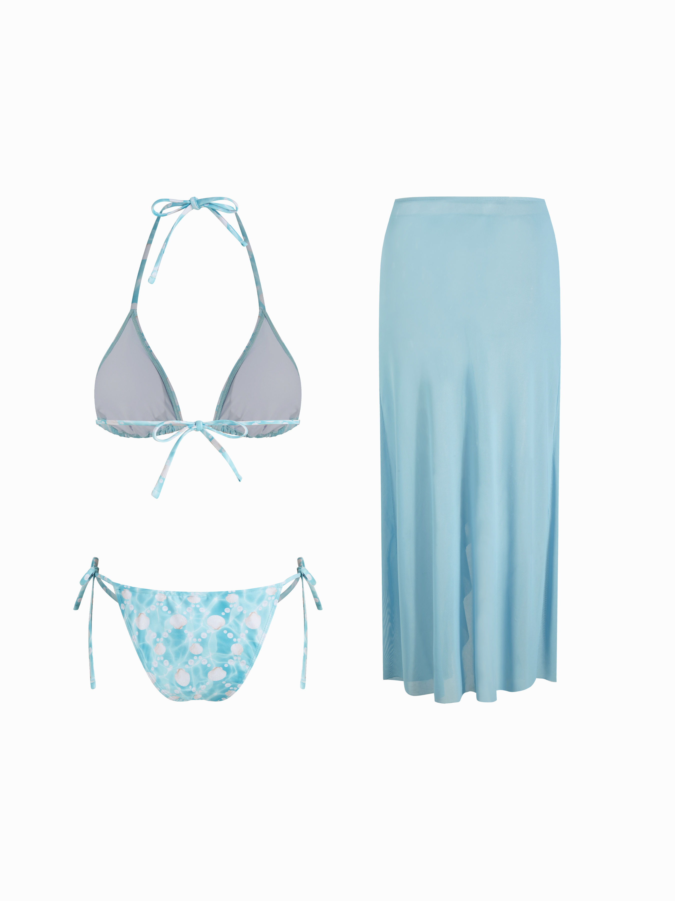 V-neck Halter Shell Graphic Tie Side Bikini Set With Beach Skirt