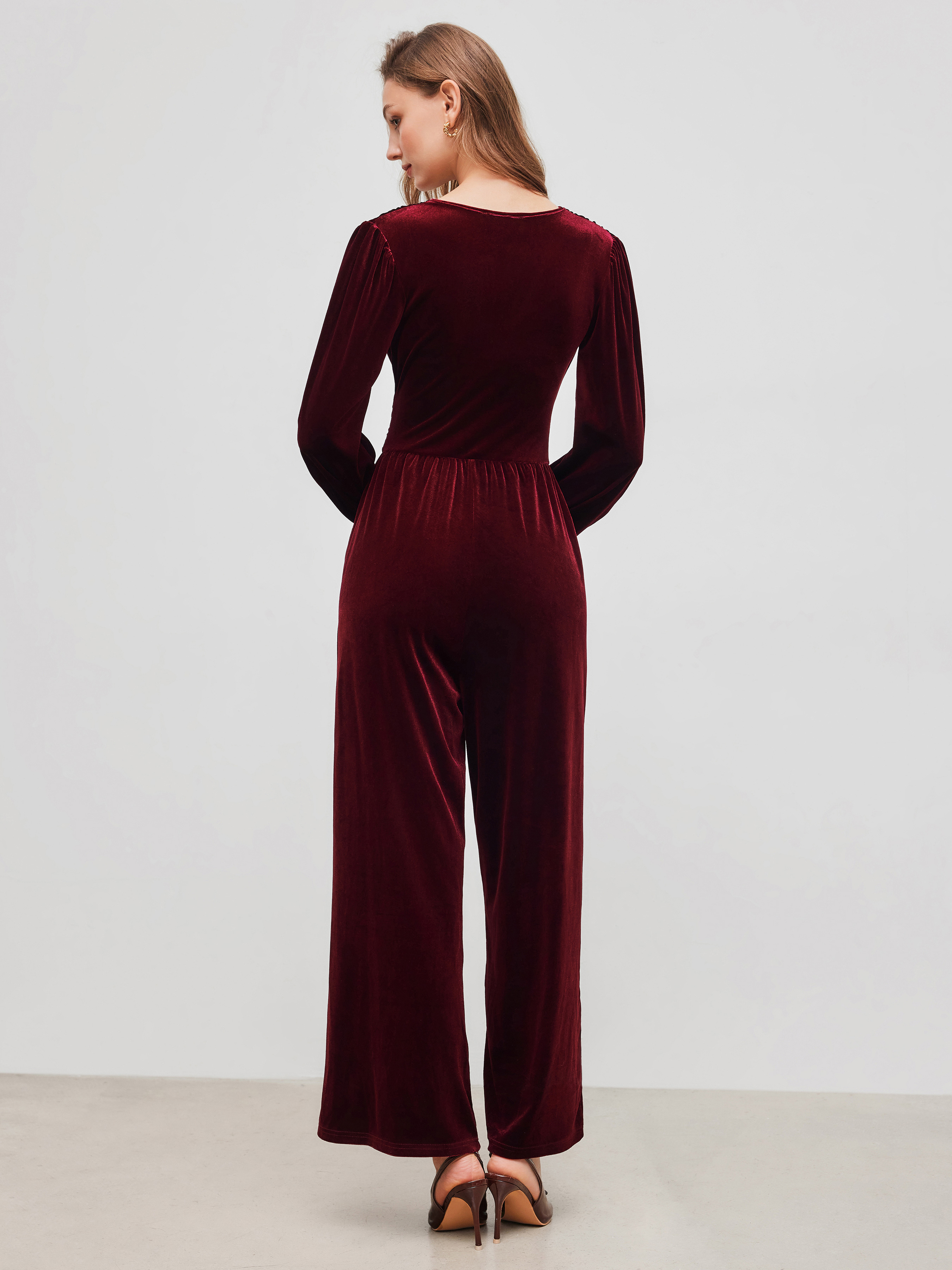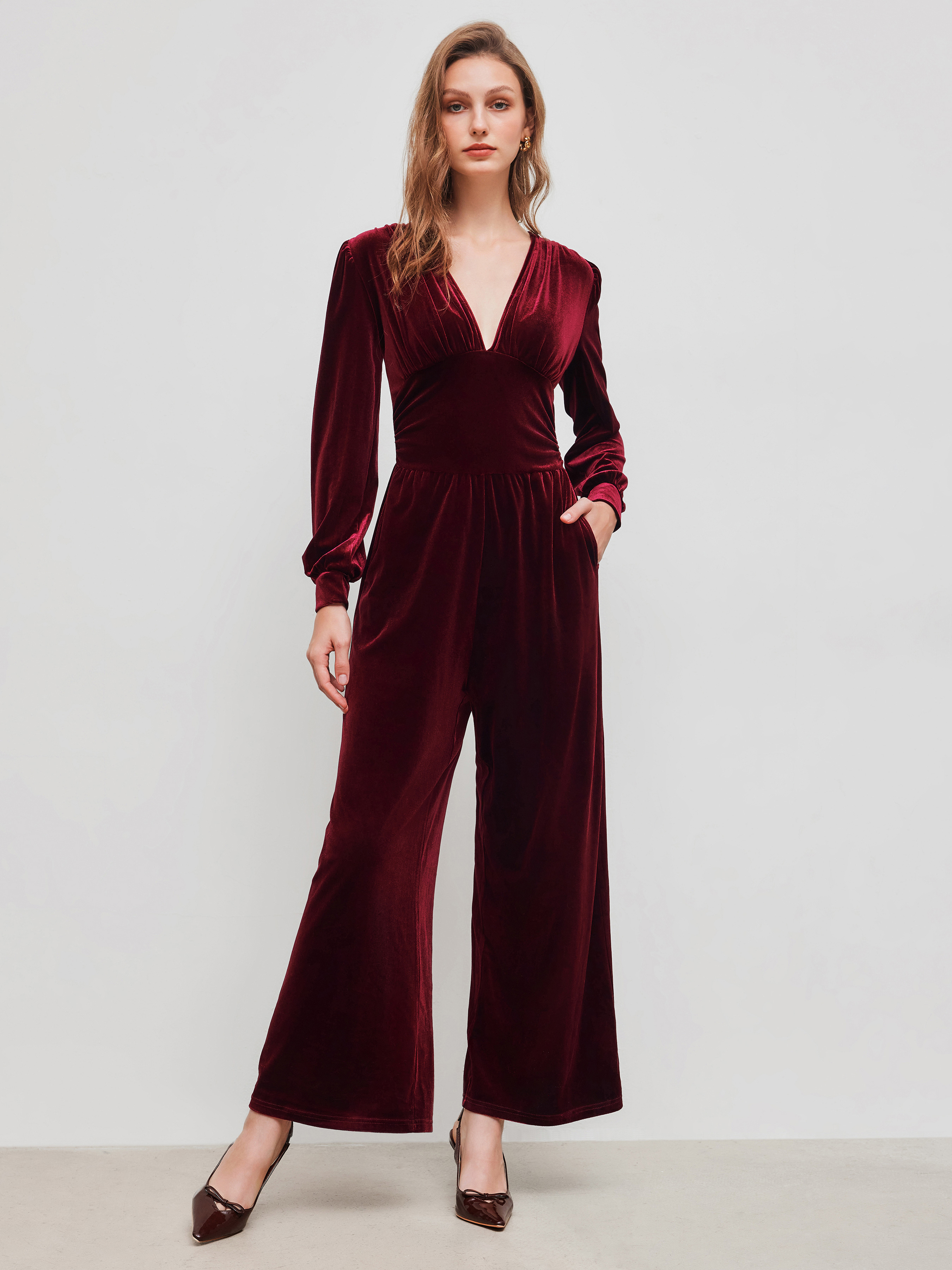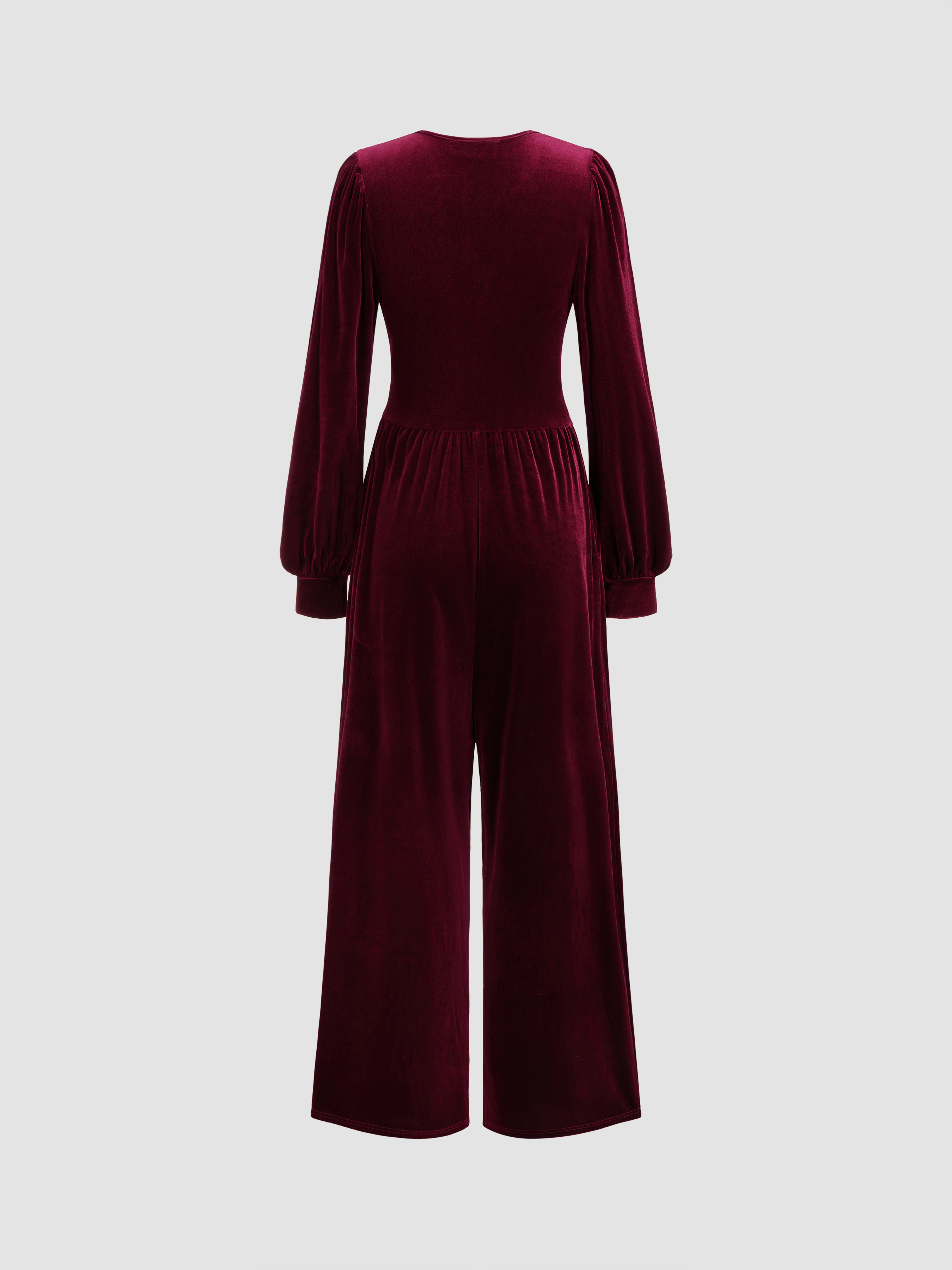 Velvet V-neck Solid Ruched Pocket Wide Leg Jumpsuit