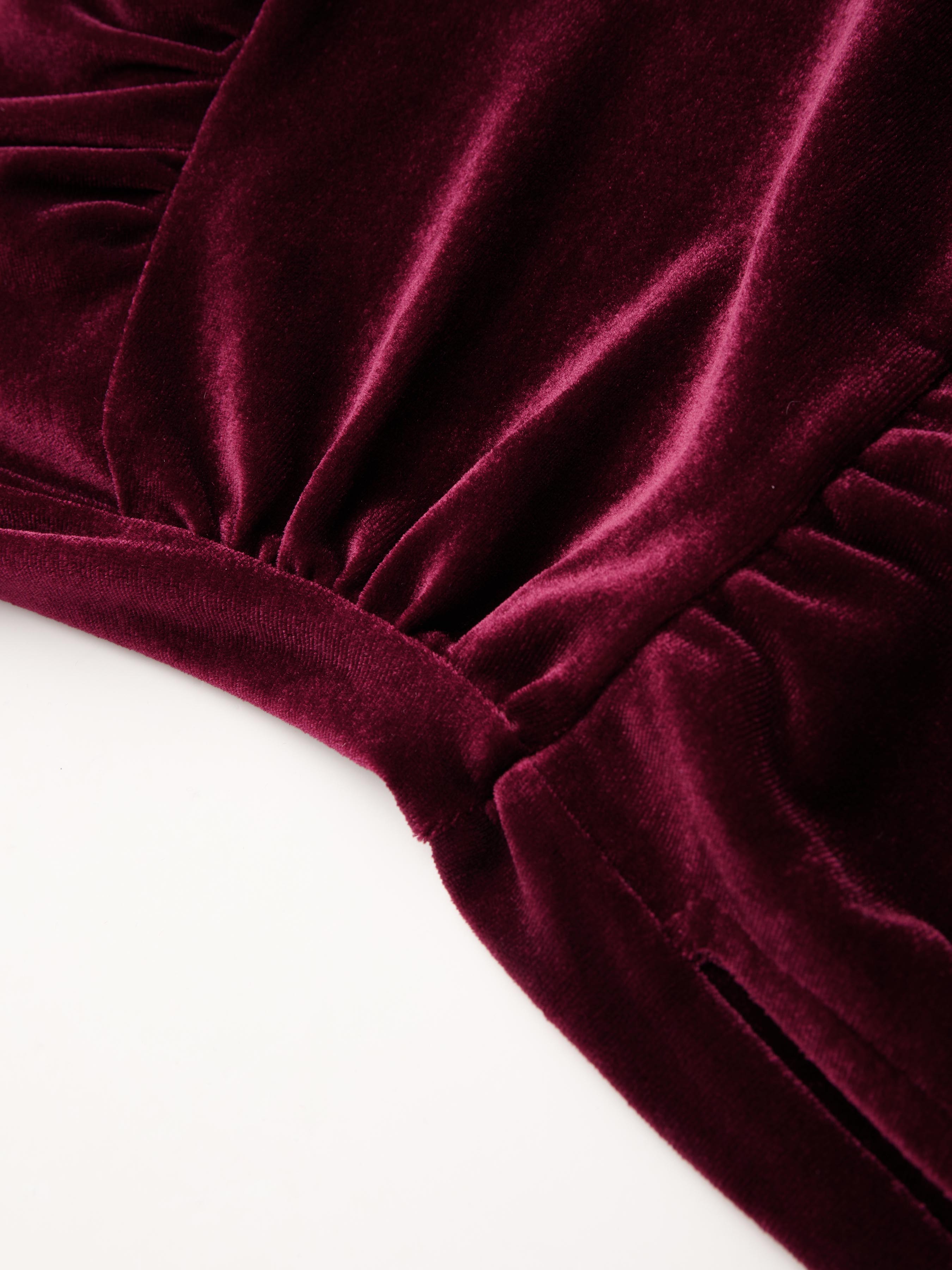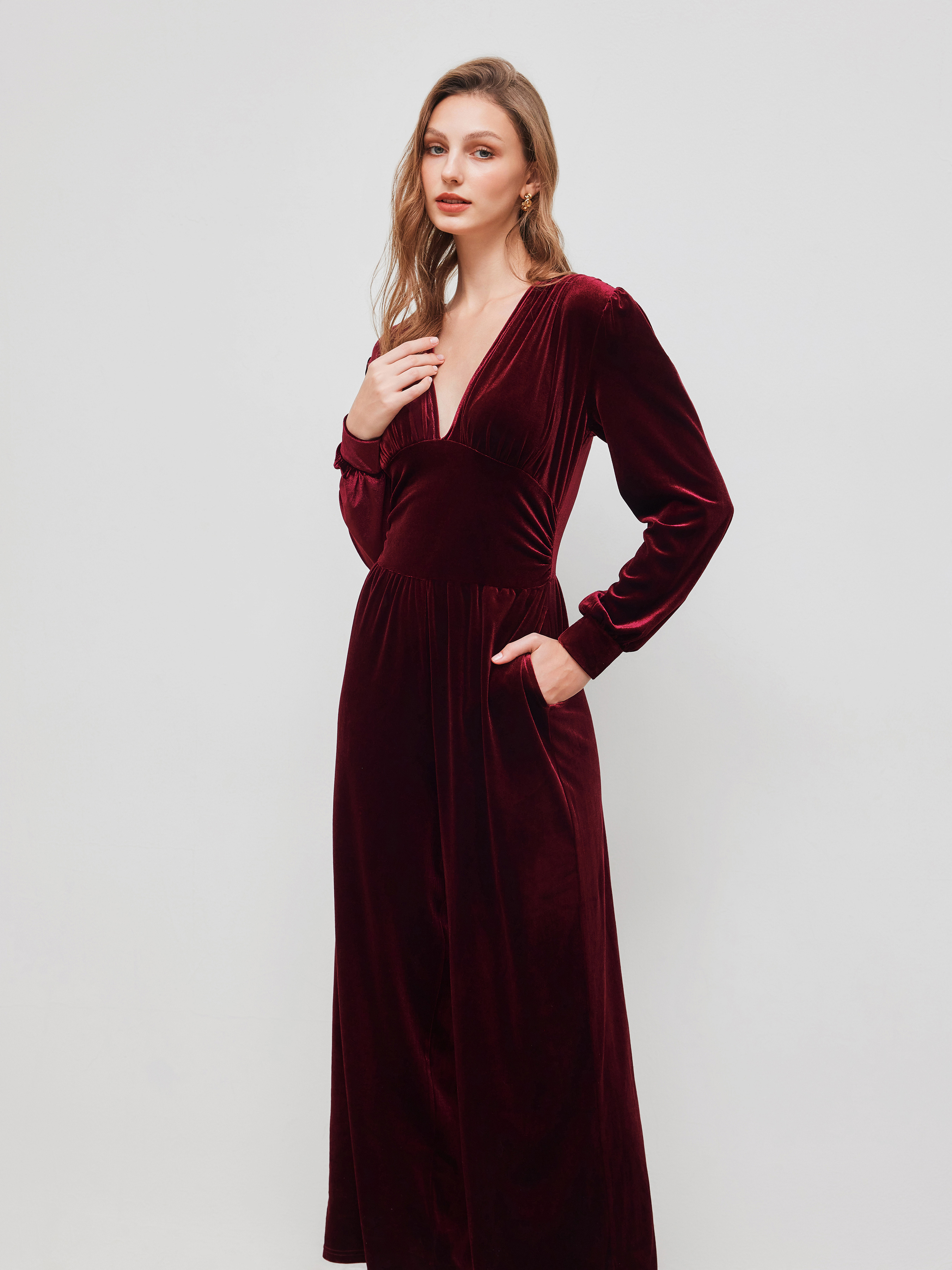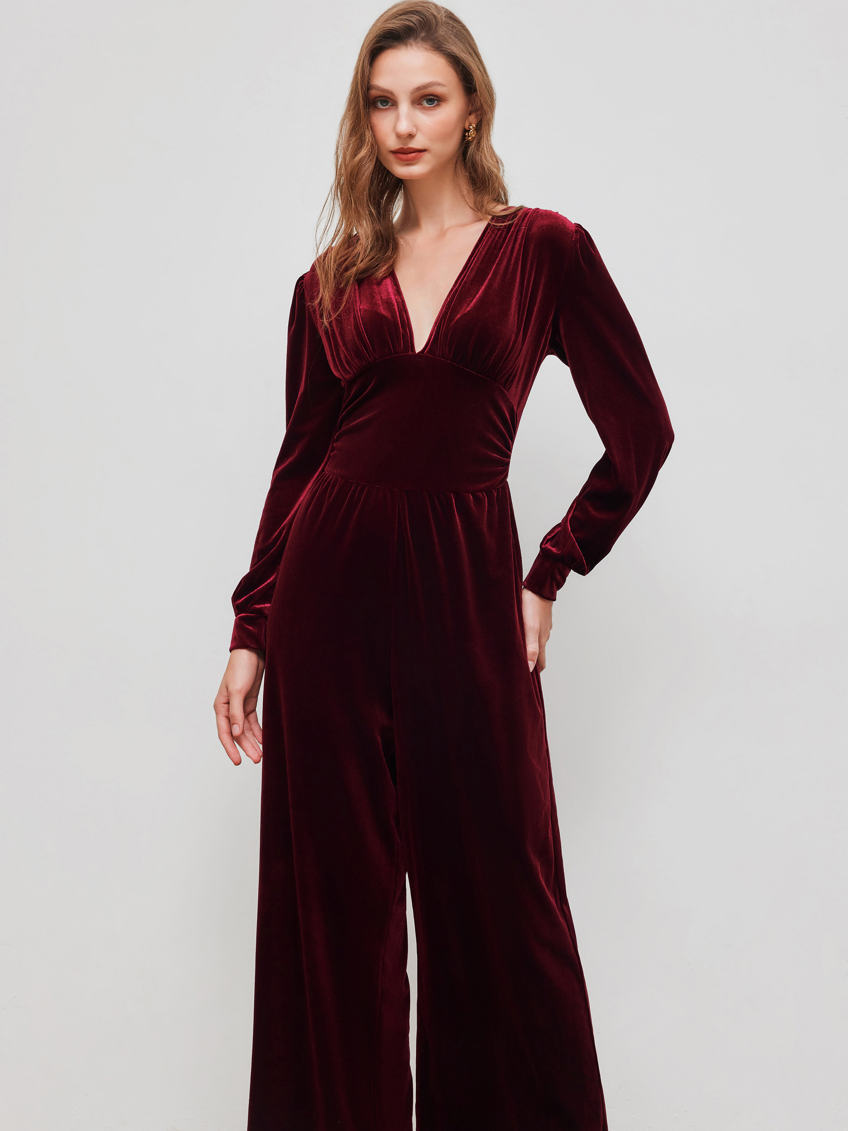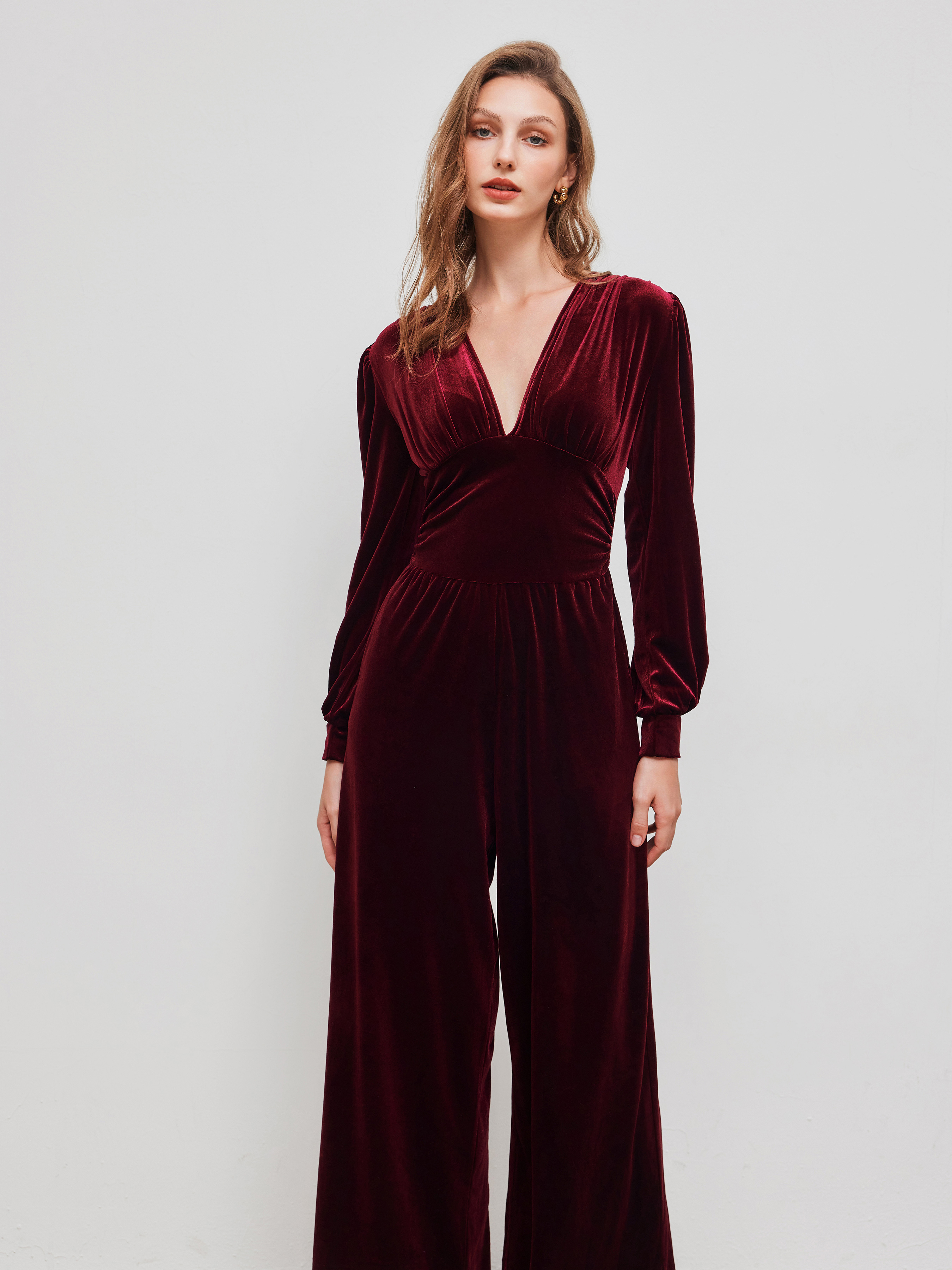 Velvet V-neck Solid Ruched Pocket Wide Leg Jumpsuit